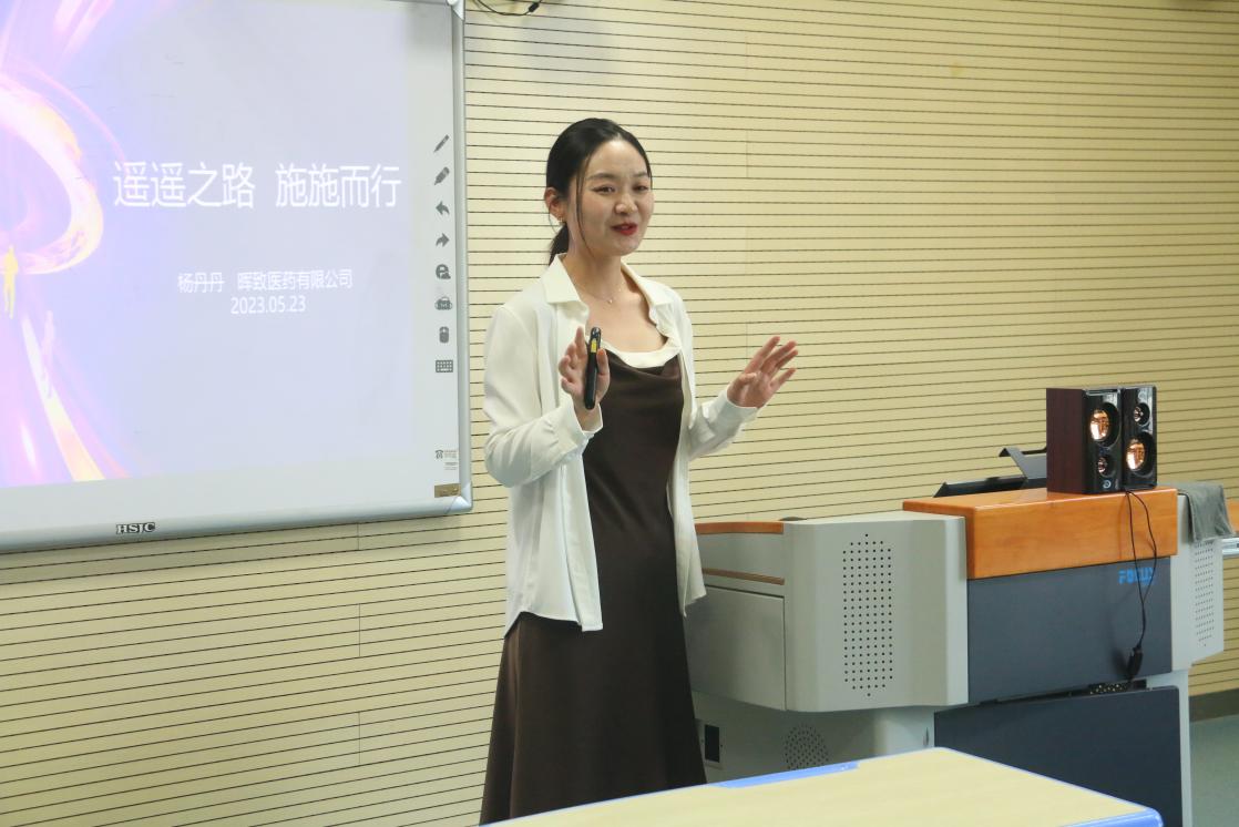 会上,杨丹丹做了以“遥遥之路 施施而行”为主题的交流分享,从认识自我、环境分析、职业目标和计划执行四个方面层层递进地为学生们讲解如今的就业情况和形势,引导学生该如何择优选择职业目标和路径,并用高效行动去达成职业目标。杨丹丹还介绍了自己现任职单位晖致医药有限公司的发展概况、工作内容和工作体会;分享了自己求职心路历程、职业选择、切身感悟等,用自己的亲身经历告诉同学们,专业的学习不是一蹴而就的,要在实践中不断丰富自己,要学会把握机会,在提升学识的同时提升眼界,不断提升自己的专业水平。