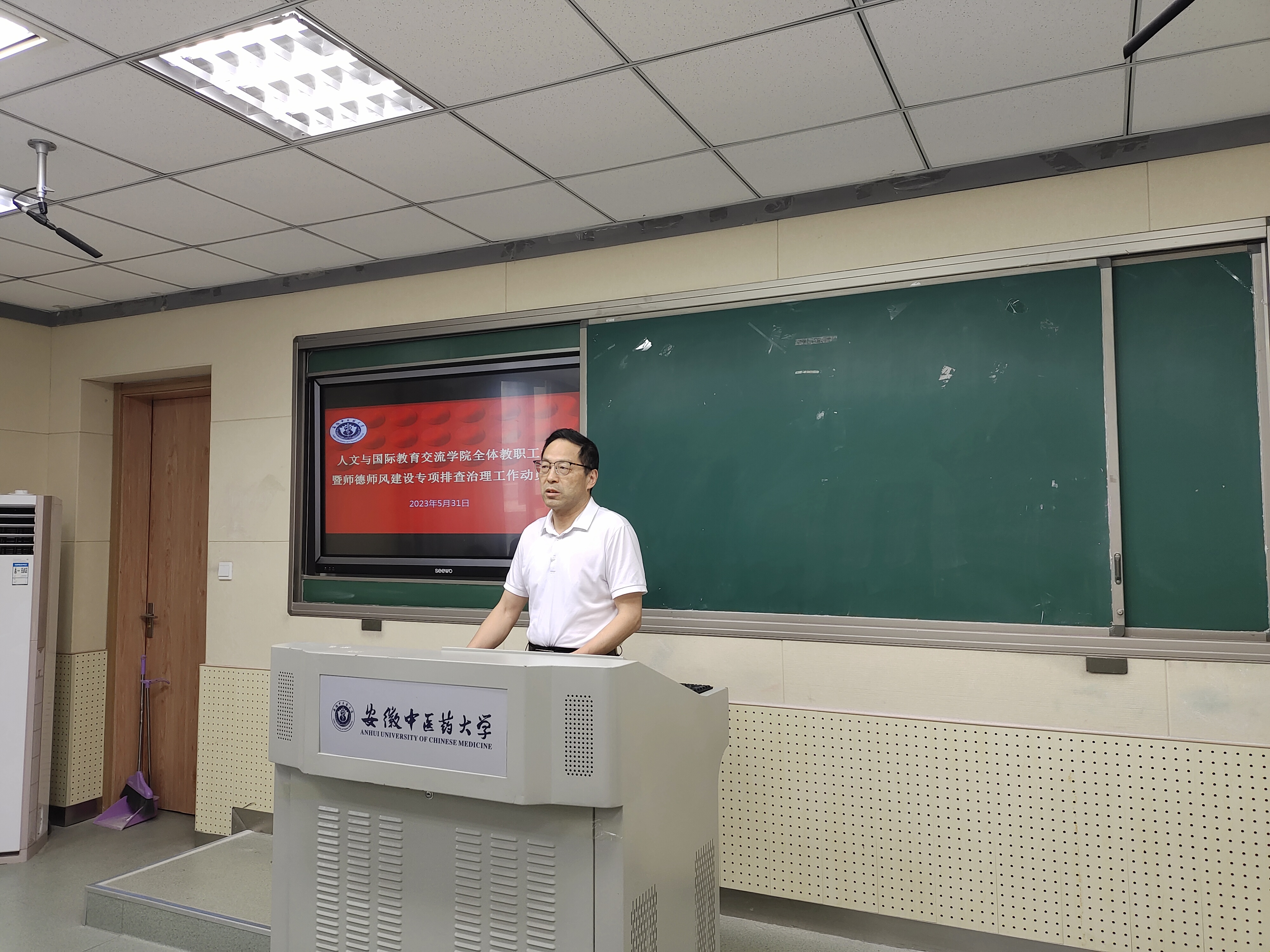 张筱荣就近期学院的教学科研学生工作进行具体安排;传达了教育部公开曝光第八批8起违反教师职业行为十项准则典型案例,以及《安徽中医药大学2023年师德师风建设专项教育实施方案》的通知精神,并要求全体教职工要高度重视此次专项排查治理工作,按照通知要求认真开展自查自评工作,希望全体教职工自觉加强自身的师德师风建设。