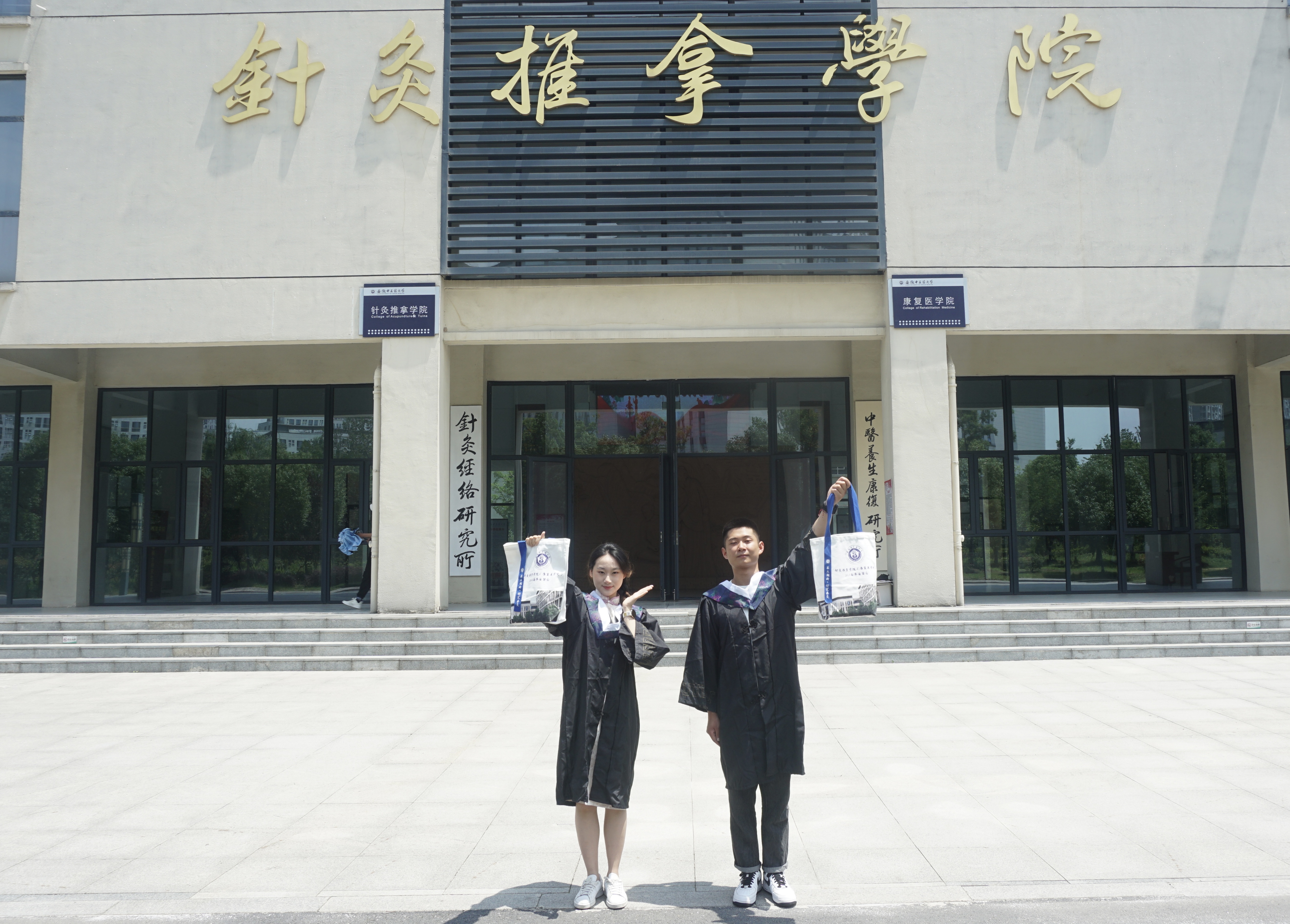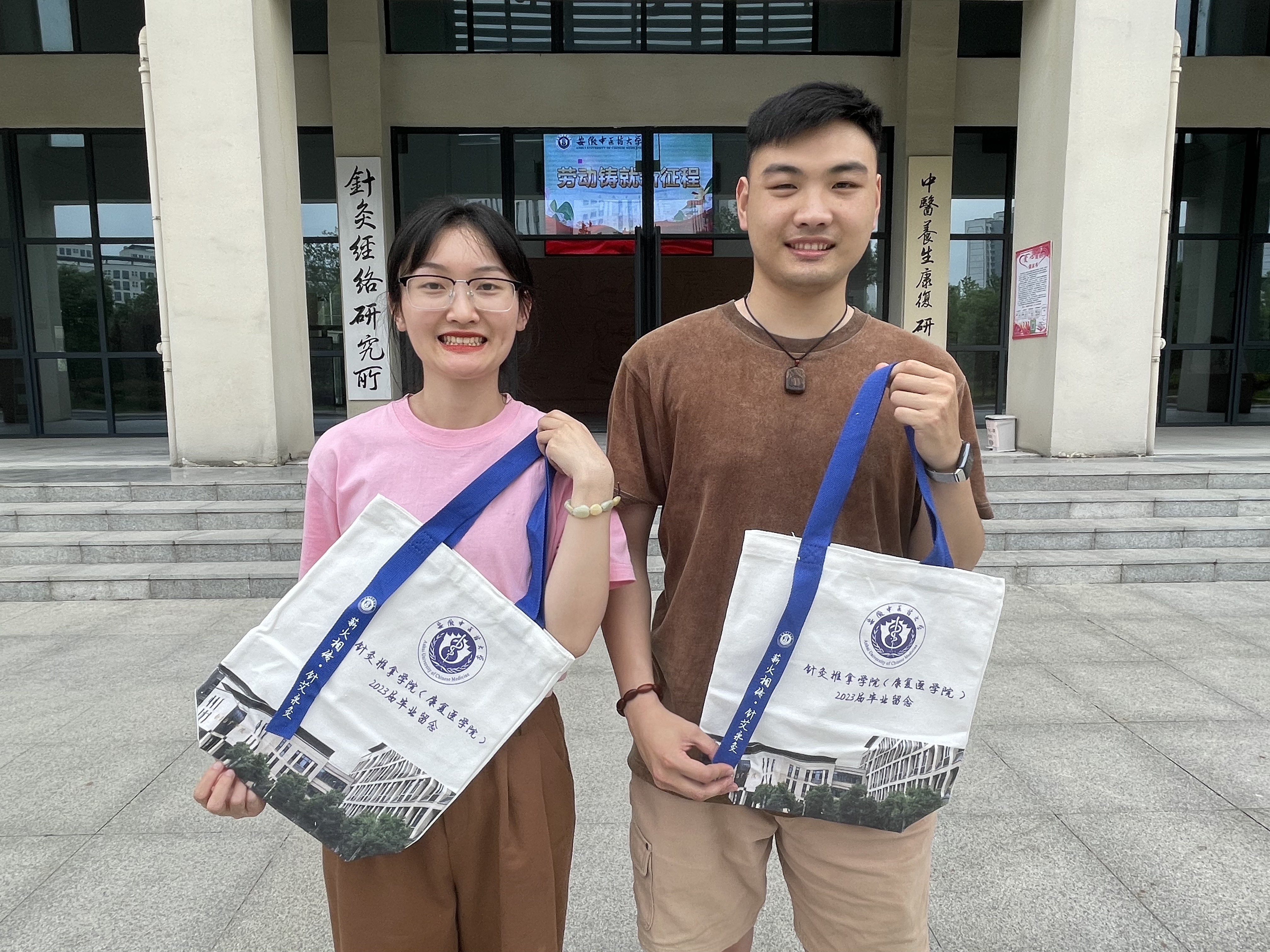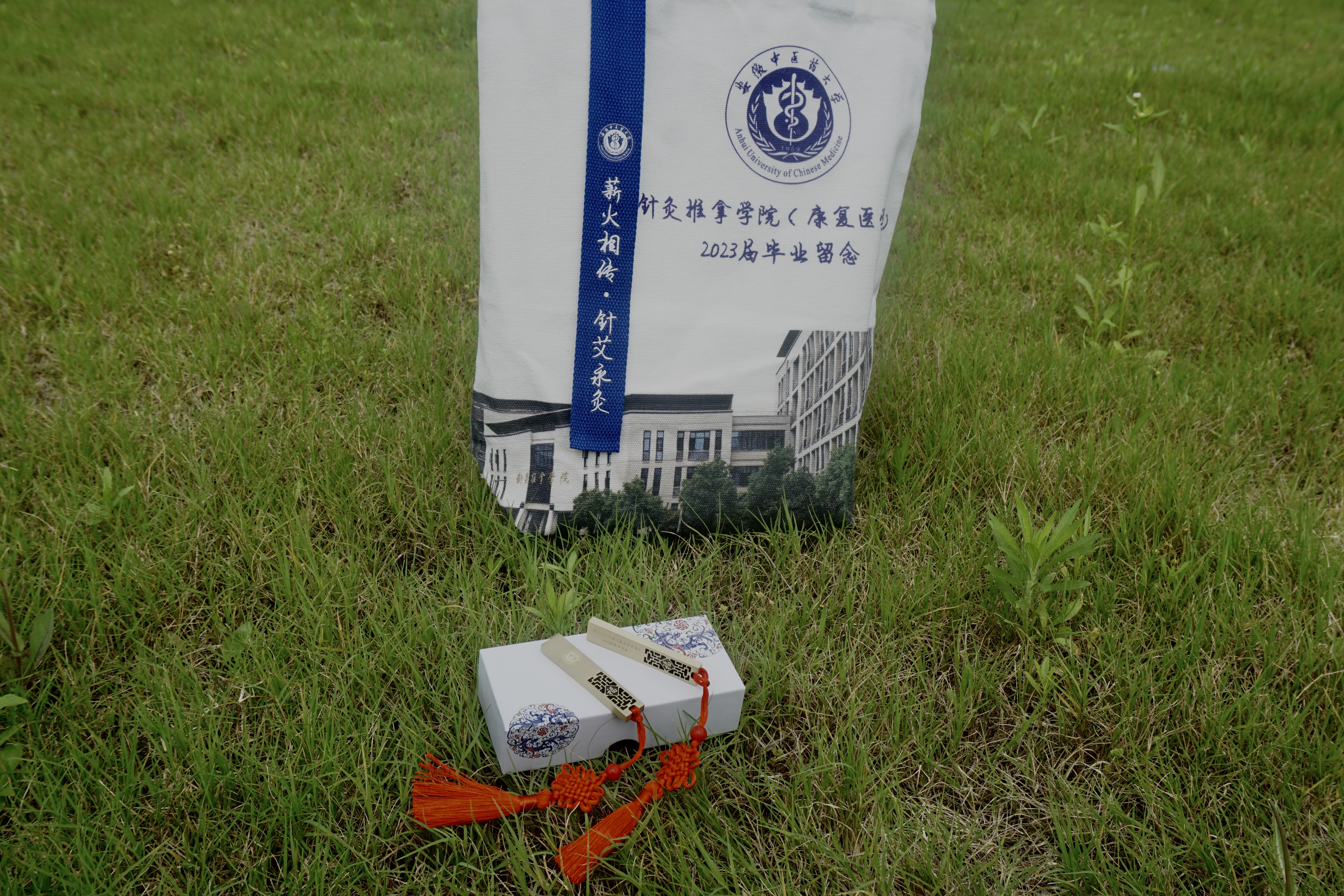 学院为毕业生们定制了专属手提帆布袋,“薪火相传 针艾永灸”的飘带在风中飘荡,针灸推拿学院全貌在手提袋上定格,象征着针苑虽无法与你们同行,但针苑永远与你们同在。
