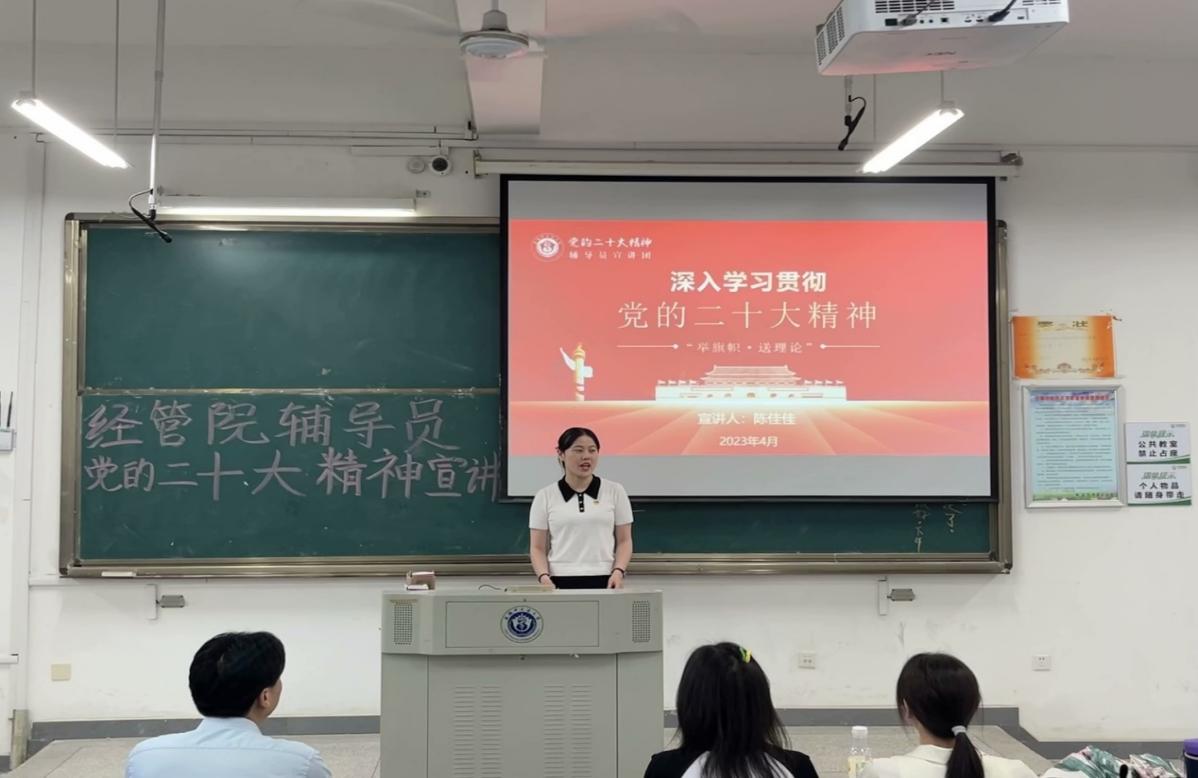为全面深入学习贯彻党的二十大精神,引导同学们增强责任感和使命感,坚定理想信念,学好本领,成为担当民族复兴大任的时代新人,6月6日下午,医药经济管理学院在教学楼A205开展了党的二十大辅导员层面宣讲活动,医药经济管理学院辅导员彭青和老师、孙孝涧老师,针灸推拿学院辅导员陈佳佳老师进行宣讲,2021级、2022级部分学生代表参加。
