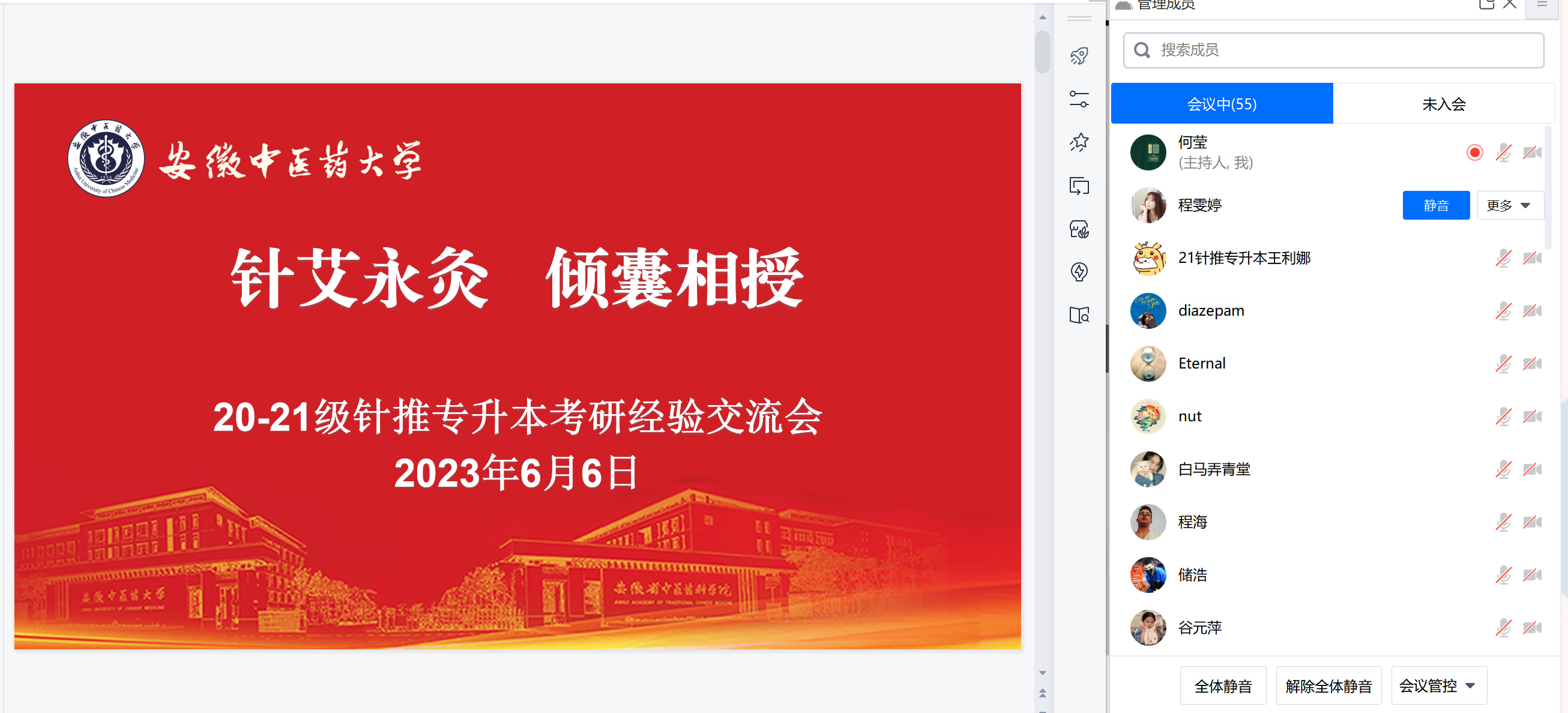 为使2024届毕业生以充分的准备、饱满的斗志迎接研究生入学考试,6月6日晚,针灸推拿学院召开2020级-2021级针推专升本班考研经验交流会,交流会邀请到2020级针推专升本班5位拟录取的毕业生进行交流,2021级针推专升本班全体同学参会。
