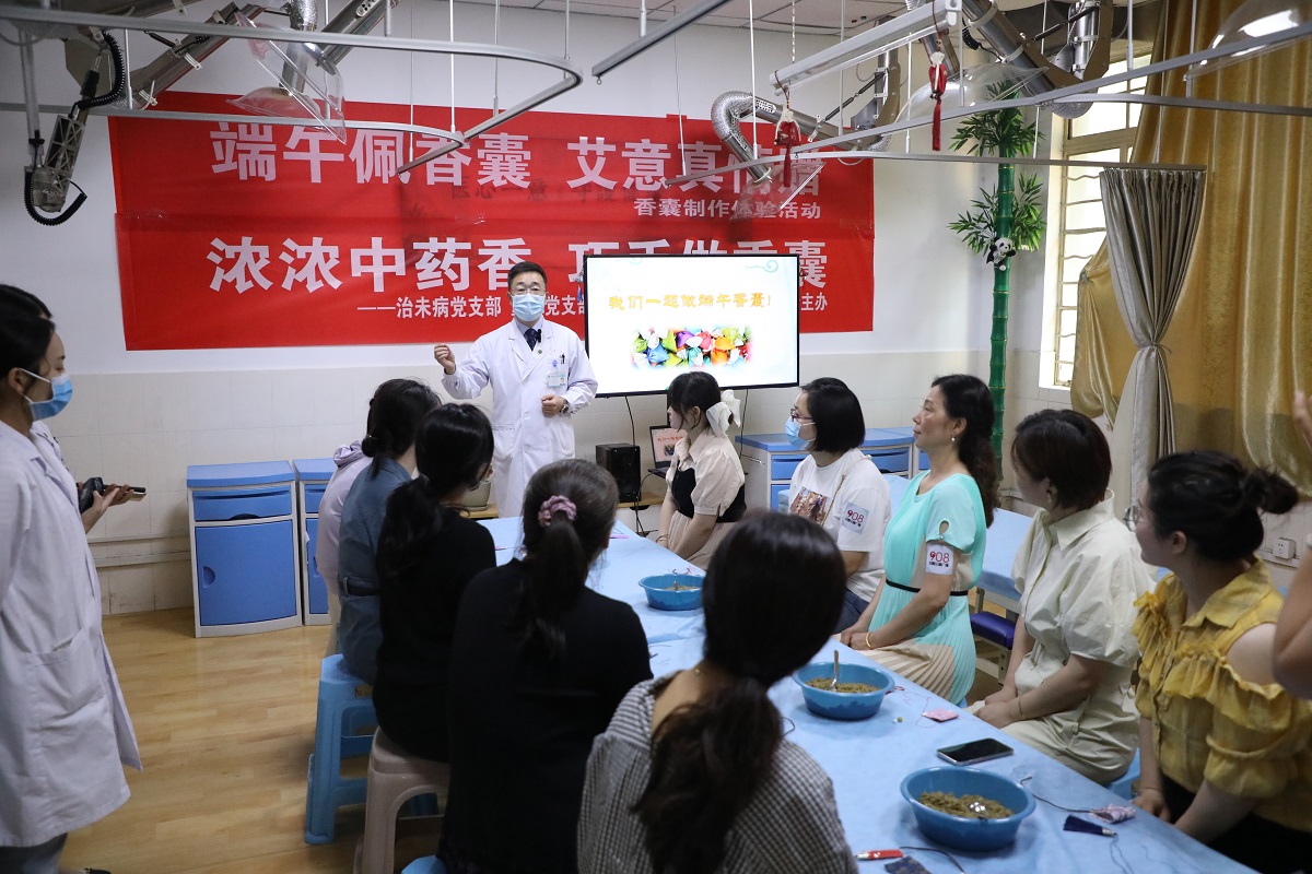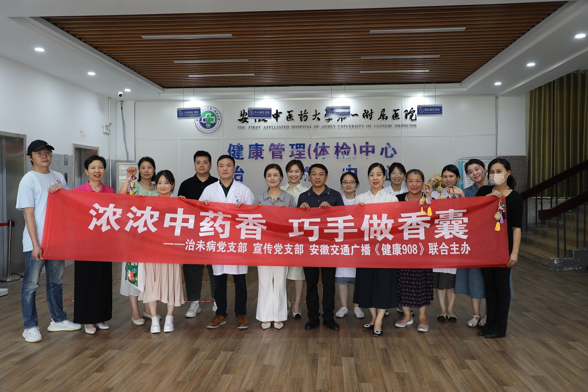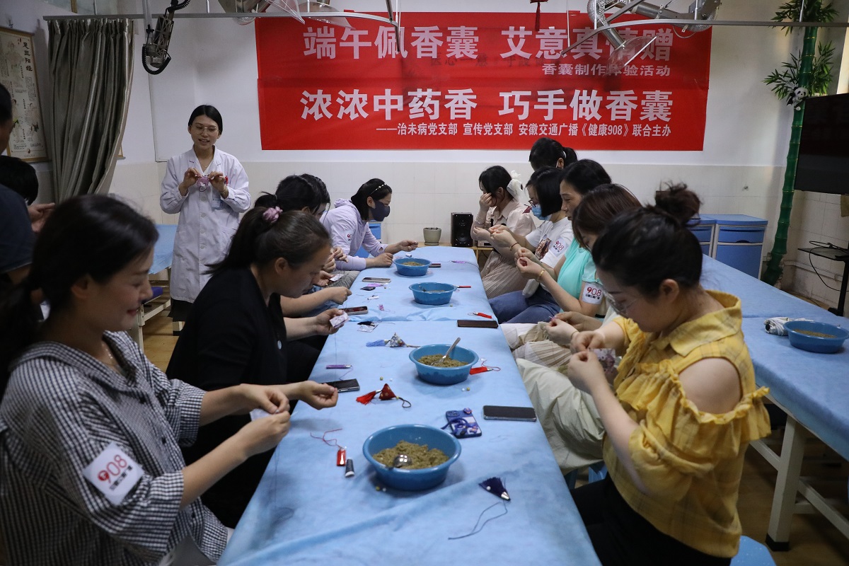 为深入开展学习贯彻习近平新时代中国特色社会主义思想主题教育,传承创新中医药文化,提升中医药服务能力,6月13日,第一临床医学院宣传党支部、治未病党支部联合安徽交通广播《健康908》栏目在医院治未病中心开展“浓浓中药香 巧手做香囊”活动。