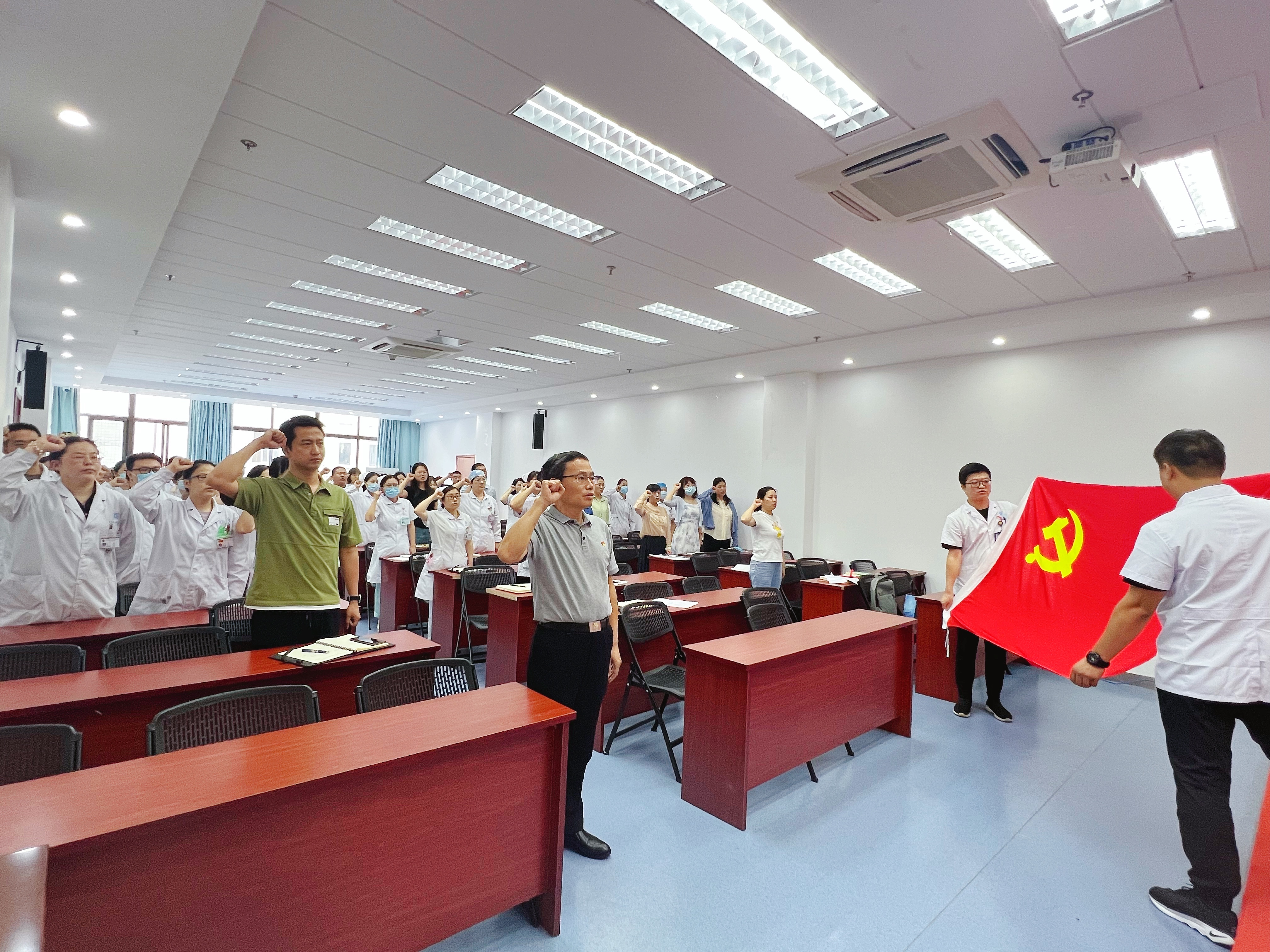 6月30日,医院党委副书记翟从永在康复中心三楼报告厅率全体党员重温入党誓词。活动中,各位党员高举右手,齐肩握拳,再次庄严宣誓。“我志愿加入中国共产党……随时准备为党和人民牺牲一切,永不叛党。”铿锵恢宏的誓词,声声震耳,强烈震撼着在场的每一位党员,充分体现了党员同志们对中国共产党的无限忠诚和热爱。一颗初心 ,一句誓言, 一生党情。
