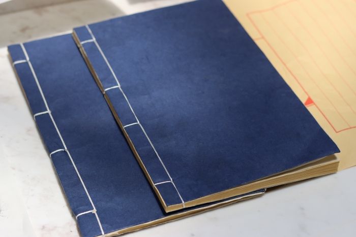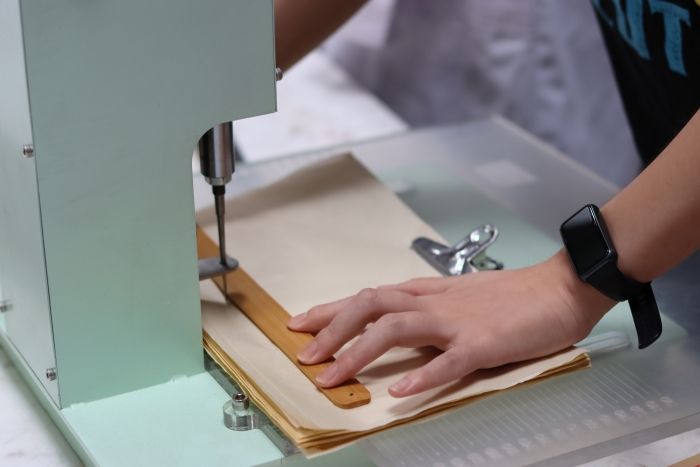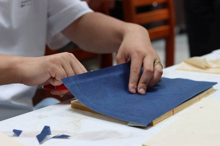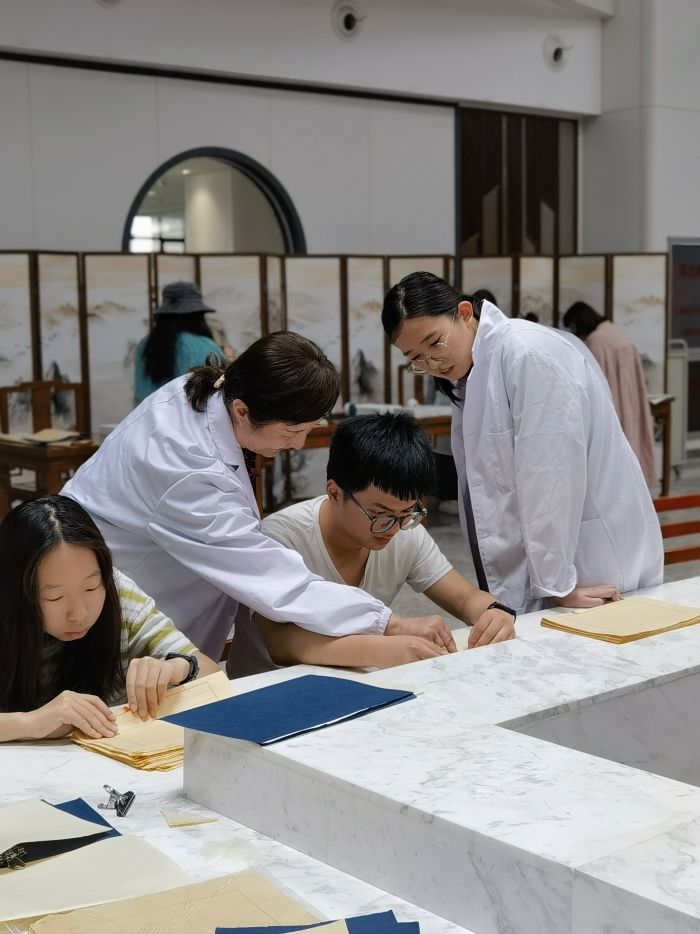活动过程中,古籍部邓勇、茆可人、殷寻嫣、卢虹宇、裘旎五位老师带领同学们进行折页、压平、齐栏、打眼、定纸捻、上封皮、订线等操作,亲手制作属于自己的线装书。