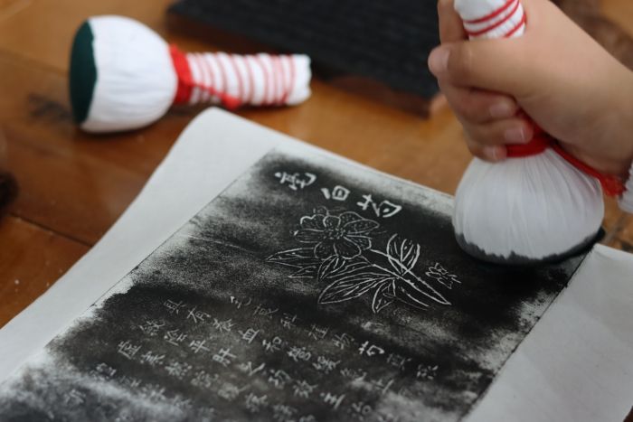同学们对于雕版制作和拓片活动表现出浓厚的兴趣,认真的参与制作体验,纷纷展示自己的制作成果。