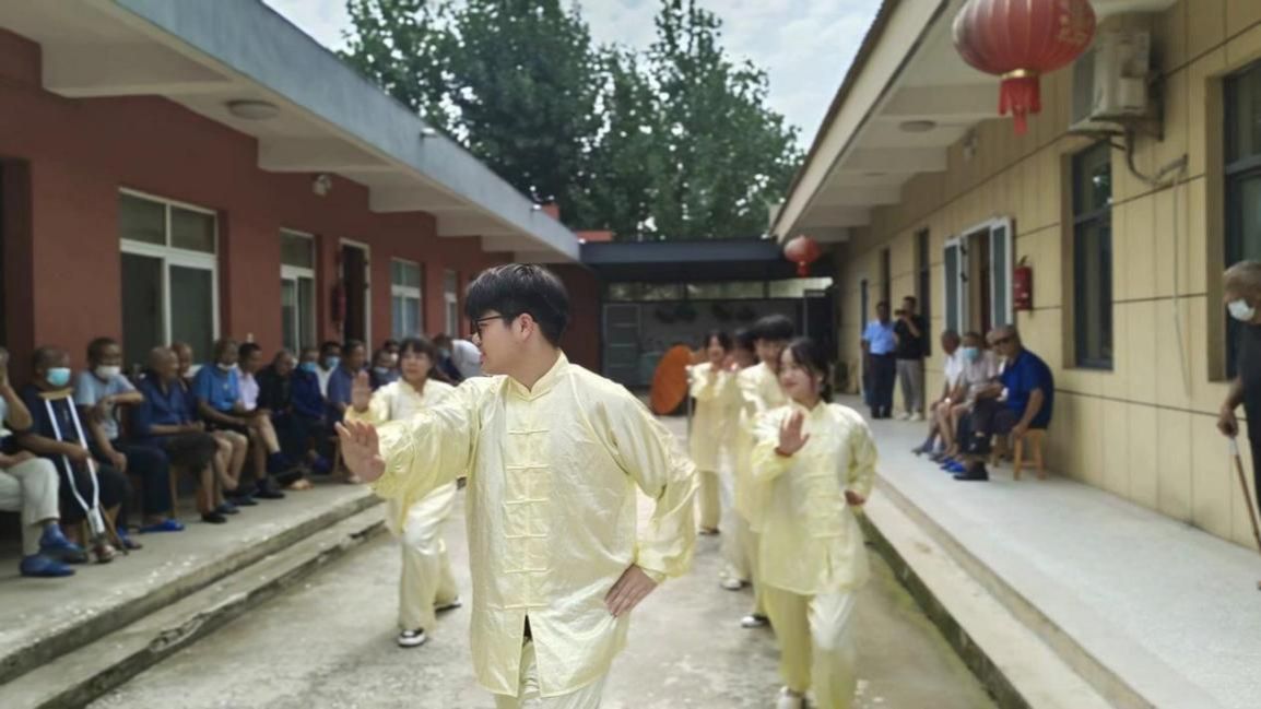 武当太极拳,华佗五禽戏;走进养老院,助力健康行。王梦晴等六名队员在养老服务中心进行了太极拳现场教学表演,王梦晴个人进行了五禽戏推广展示活动,引起了老人们对中医药传统文化更浓厚的兴趣。