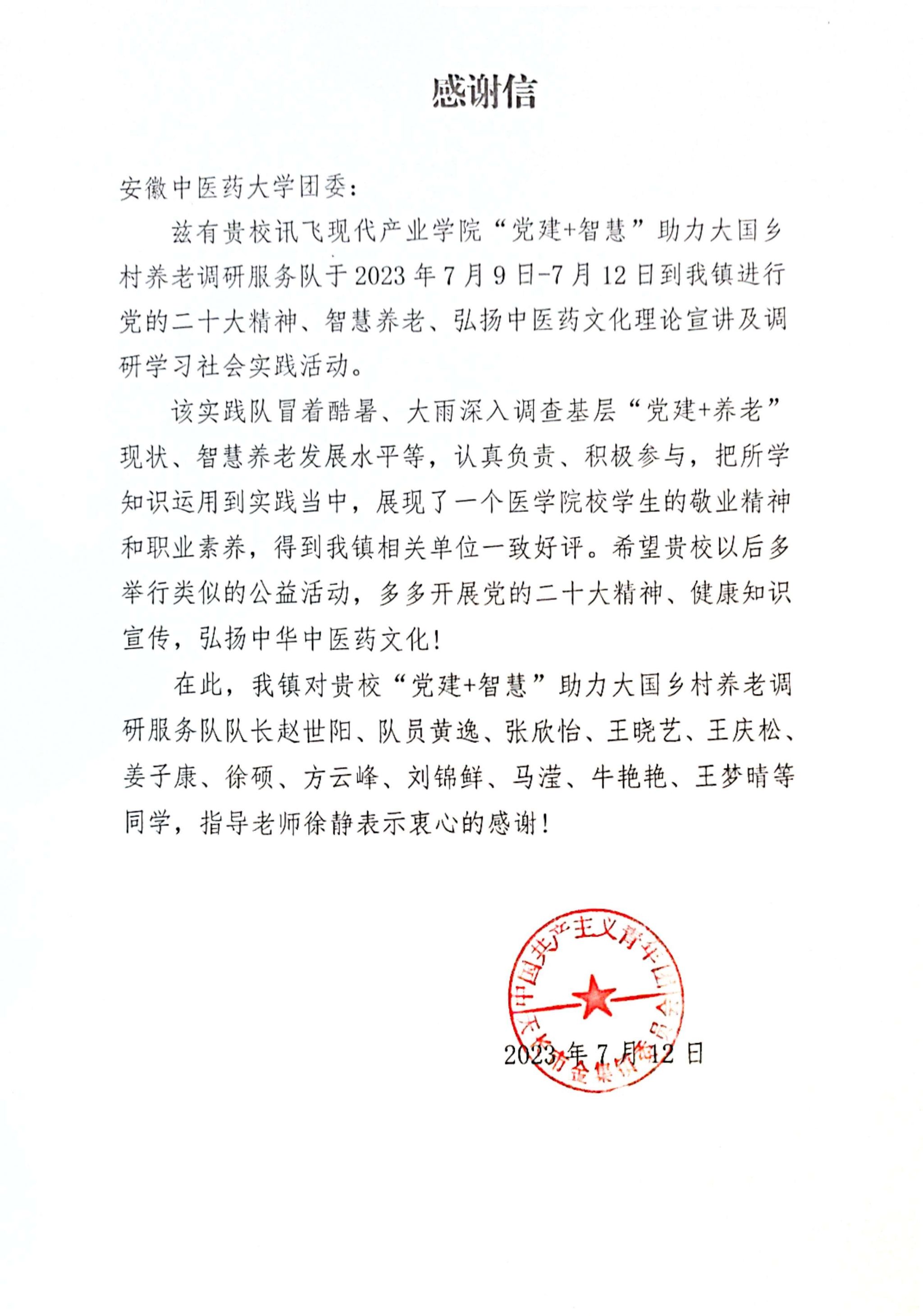 经过6天的理论宣讲和调研服务,安徽中医药大学讯飞现代产业学院“党建+智慧”助力大国乡村养老调研服务队得到了当地单位的一致好评,共计收到感谢信8封,表扬信1封,实践证明1份。