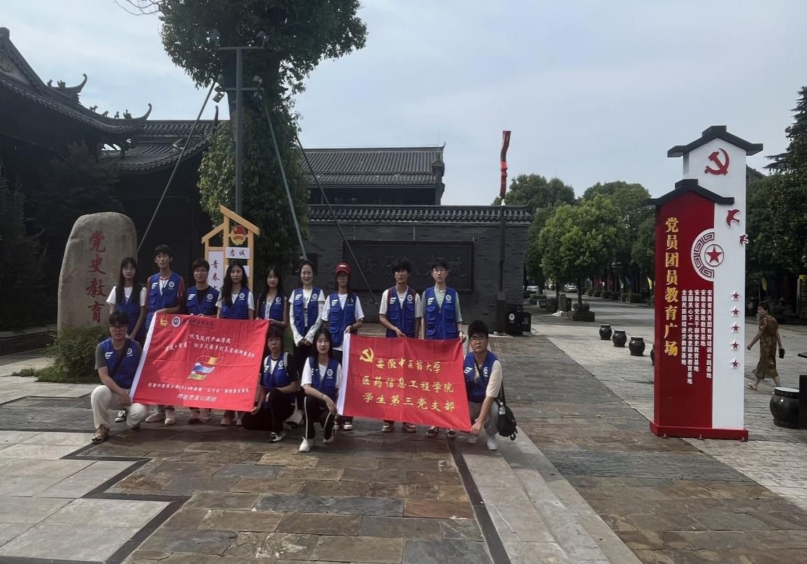 在红色古地,传时代精神。队员们与天长市中小学生共同体会红色文化,感悟先烈无畏精神,立志吾辈当自强。为扩大影响力,团队开启多平台直播,成立“党建+智慧”助力大国乡村养老“临时团支部”和医药信息工程学院第三学生党支部进行“云共建”,党建带团建,上好生动活泼、意义深长的团课、党课,用情打造了行动的“红色基因展览馆”。