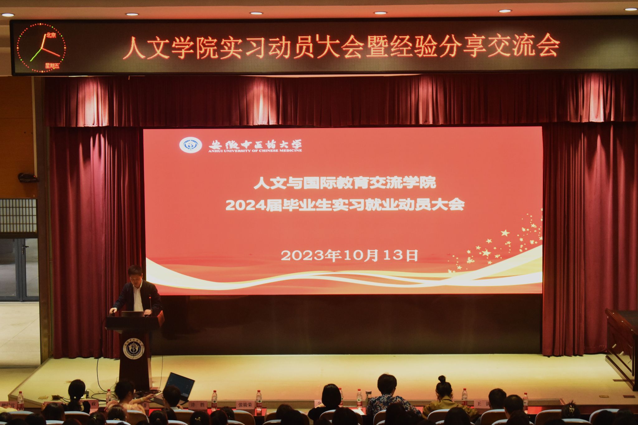 10月13日下午,人文与国际教育交流学院2024届毕业生实习就业动员大会在少荃湖校区教学楼A114教室召开。学院党总支书记金晓琴、教学副院长张筱荣,汉语国际教育系主任张雷平、心理系副主任许胜,实习就业办、分团委、学工办、党政办 负责老师、辅导员以及全体2024届毕业生参加本次会议。会议由张筱荣主持。