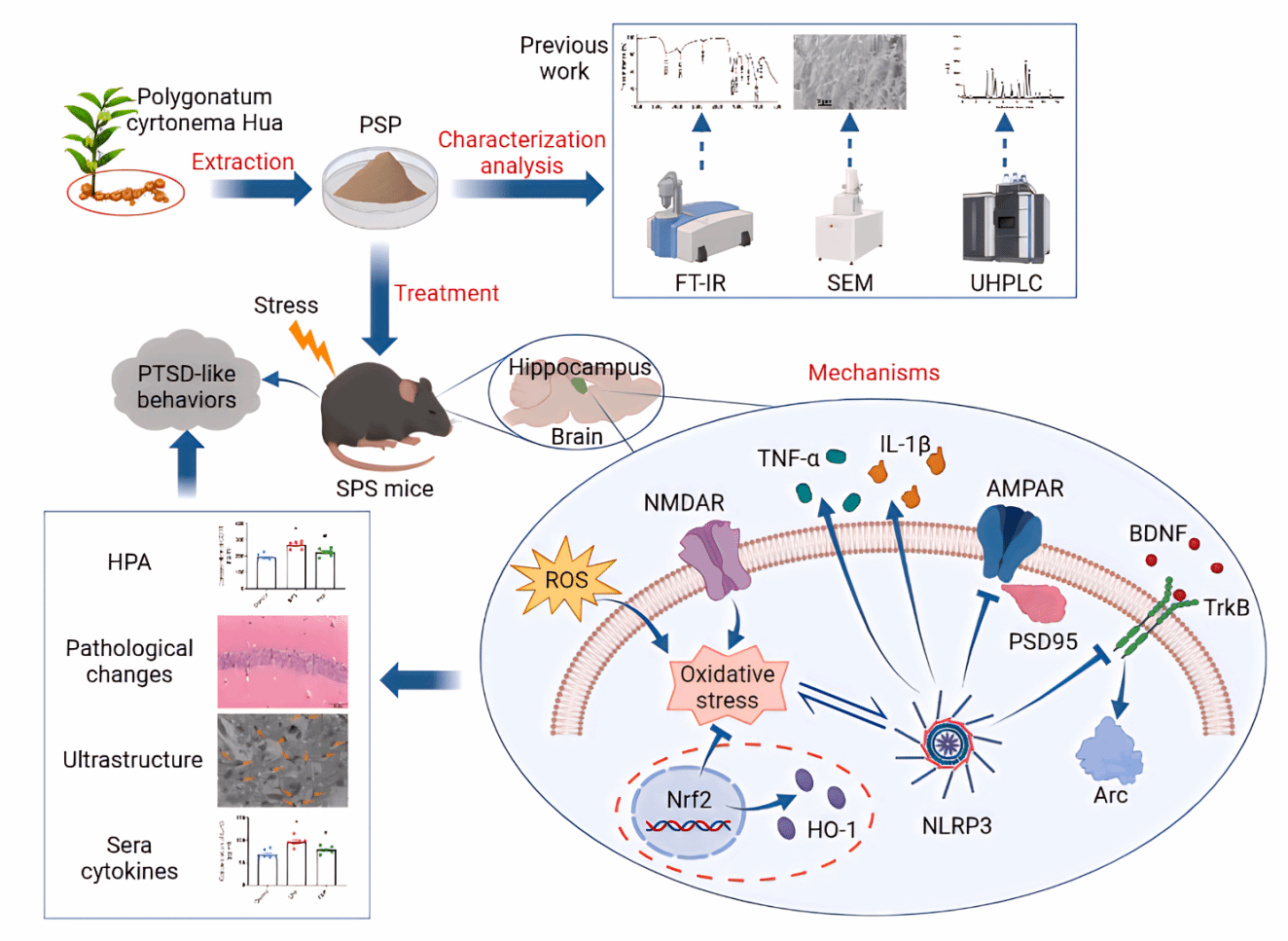 研究团队发现,具有安神定志、益气镇惊功效的安神定志方可通过调节mTOR依赖的海马突触功能改善SPS模型创伤后应激障碍(PTSD)样行为(该成果发表在Phytomedicine杂志,doi: 10.1016/j.phymed.2022.154139);远志可安神益智,团队以阿尔茨海默病为病症表型,结合生物信息学和药理学方法,发现远志可通过调节氧化应激、铁死亡等多通路传导改善小鼠记忆损伤,改善阿尔茨海默病(AD)症状(该成果发表在Phytother Res杂志,doi:10.1002/ptr.7930);黄精能养气血、补五脏,团队发现黄精主要成分黄精多糖可能以Nrf2/HO-1信号通路依赖的方式调节氧化应激和炎症反应,预防小鼠PTSD样行为和突触损伤(该成果发表在J Ethnopharmacol杂志,doi:10.1016/j.jep.2023.117165)(图1)。