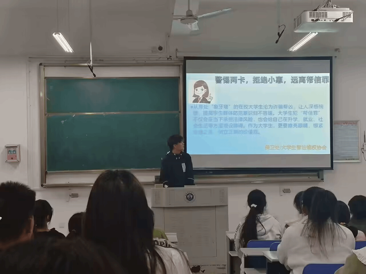 法协社团负责人袁郝建以“你不知道的帮信罪”为题,就帮信罪的概念、常见形式、判决标准展开详细介绍,重点向同学们阐述了帮信罪的风险、危害以及如何预防帮信罪。通过真实案例,深入浅出地介绍了涉“两卡”违法犯罪的特点,提醒同学们要保护好个人信息,提高警惕,杜绝参与违法犯罪行为。