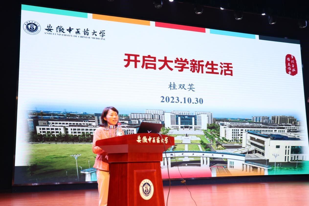 院长桂双英作学业启航教育报告,介绍药学院的历史脉络和发展现状。她建议新生培养自主学习能力、思维能力、团队合作意识、创新意识与能力、管理时间能力。她强调,新生要认识自我、找准定位、确定目标,祝愿各位同学努力学习、放飞梦想、不负韶华、绽放青春。