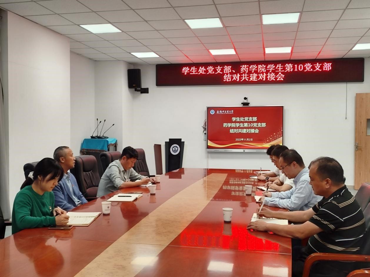 11月2日,学生处党支部与药学院学生第10党支部结对共建对接会在药学院召开。学生处处长、学生处党支部书记冯祥,药学院党委副书记徐先韬,药学院学工办主任、学生第10党支部书记方文韬及两个党支部全体委员参加对接,会议由方文韬主持。