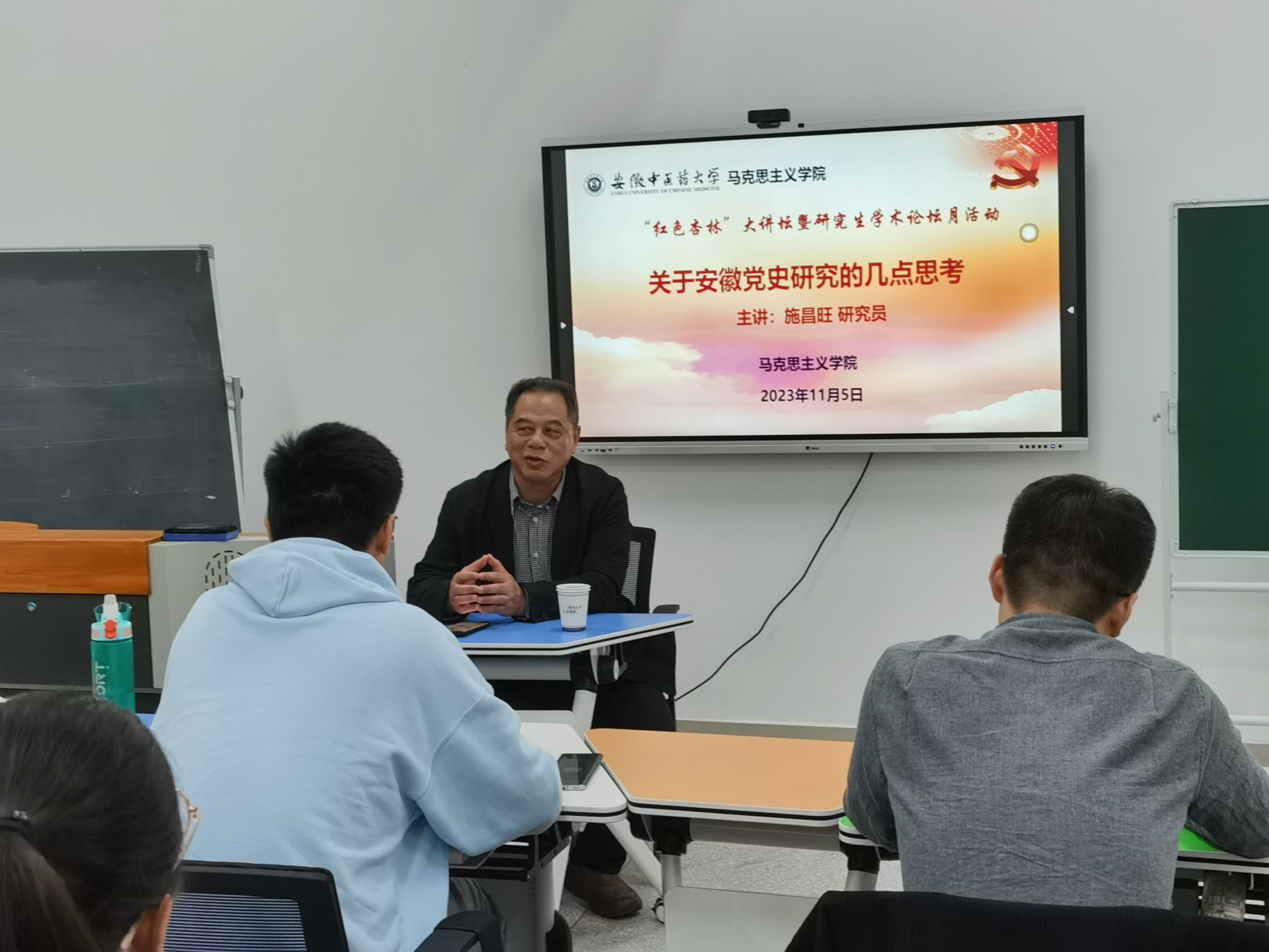 徐光寿以《马克思主义理论学科的分类与属性》为题与研究生交流,指出研究生要依据学科的分类与属性确定适合自己的研究领域和研究方向,强化问题意识、资料意识和成果意识,凸显学术研究主体性。施昌旺围绕《关于安徽党史研究的几点思考》与大家进行交流,指出做好科学研究的关键在于对学术的敬畏之心、热爱之心、创新和探索之心,坚持正确的研究方法并深耕下去。