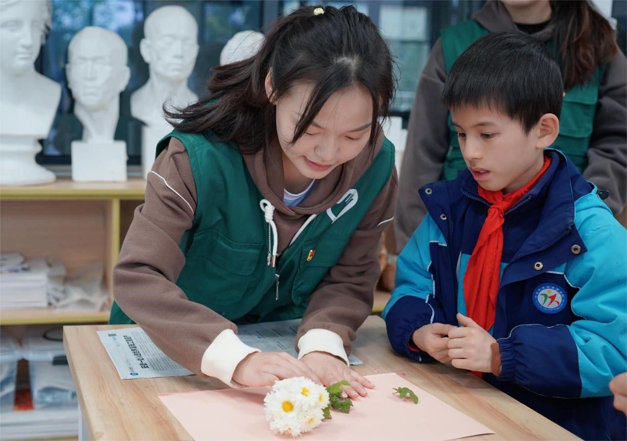 小学生们认真观察菊花形态,动手整理花枝,轻轻抖落灰尘,去除杂物……在制作过程中,他们不断尝试、调整,做出完美的标本或画作,提高了实践和创新能力。