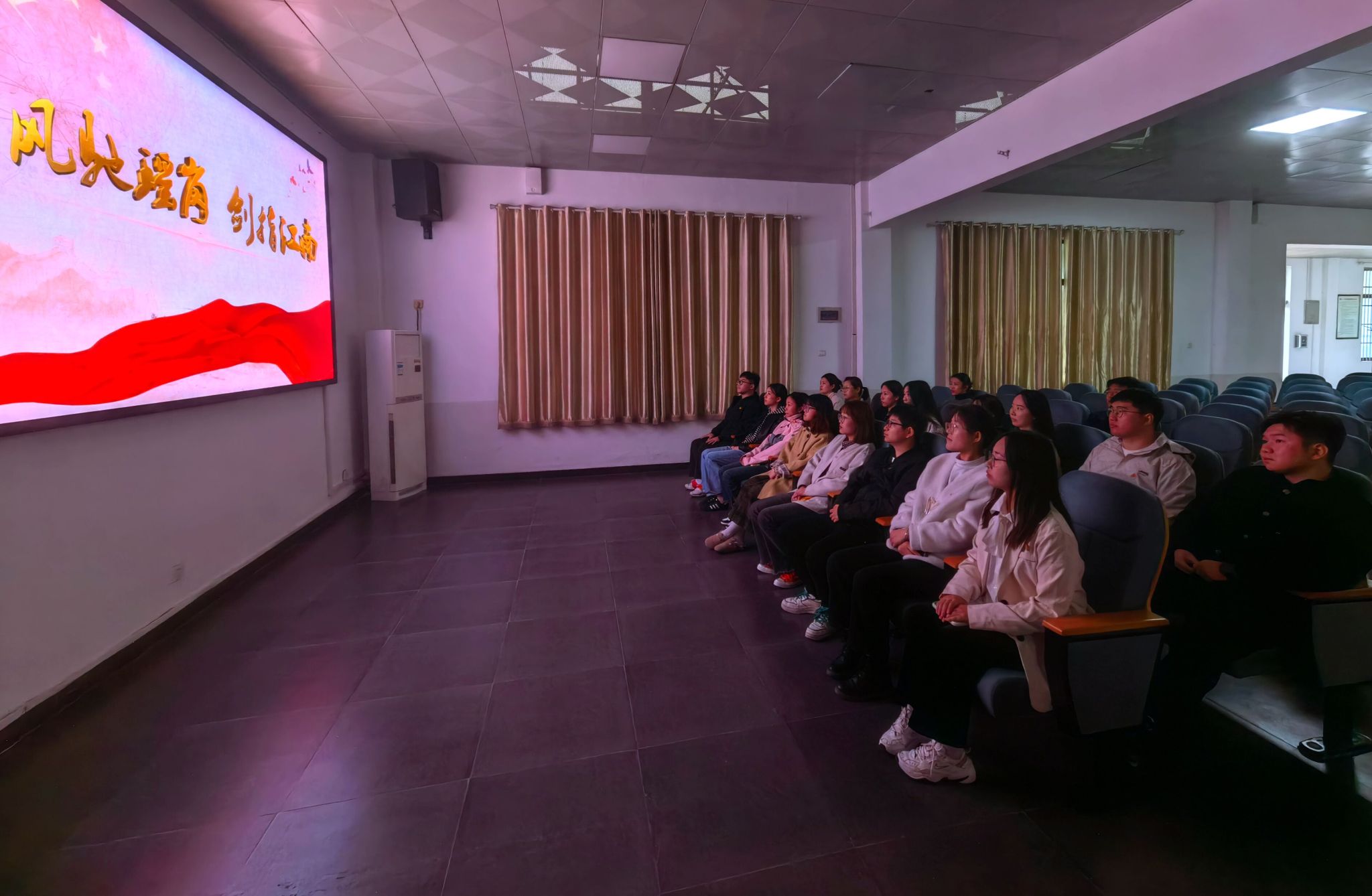 随后,全体师生乘车前往瑶岗渡江战役总前委旧址纪念馆参观学习。大家集中观看了渡江战役专题片《风起瑶岗 剑指江南》,在回顾党中央带领江北解放区人民群众进行轰轰烈烈的支前运动中,进一步坚定了理想信念。