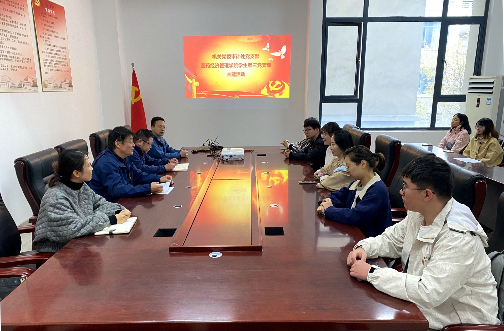 为深入学习宣传贯彻习近平新时代中国特色社会主义思想,11月10日下午,医药经济管理学院学生第三党支部联合机关党委审计处党支部开展结对共建活动,审计处党支部书记、审计处副处长郭铮以及两个支部的20余名党员及预备党员参加了本次活动。