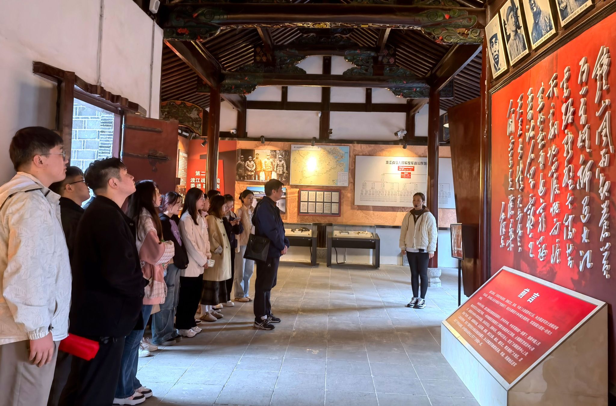 在馆内讲解员的带领下大家先后参观了“渡江颂”书画展厅、参谋处旧址、总前委旧址和中共中央华东局旧址,一件件革命文物、一份份珍贵史料、一个个红色故事,生动再现了渡江战役时期合肥人民在党领导下踊跃支前的奋斗历程。馆内详实的图文资料、丰富的实物展品、写实的微缩场景,让同学们重温了那段“运筹帷幄之中、决胜千里长江之上”的烽火岁月,深刻感悟着“坚定信念、革命到底、军民团结、奋勇争先、攻坚克难、勇于牺牲”的渡江精神。
