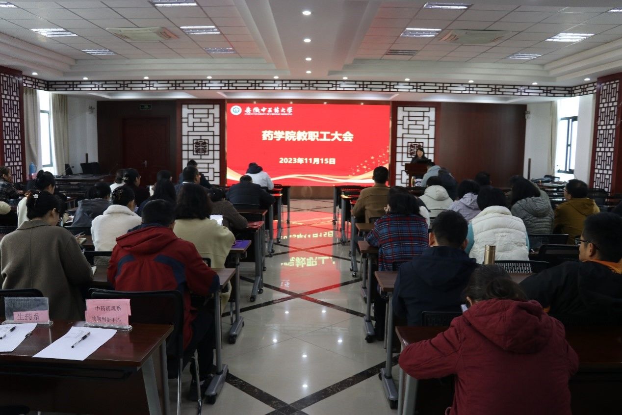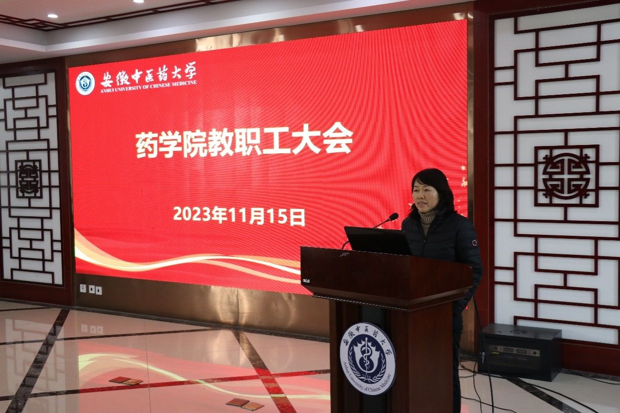 为进一步推进本科教育教学审核评估线下工作,11月15日,药学院召开教职工大会,反馈期中教学检查情况并部署本科教育教学线下审核评估工作。会议由院长桂双英主持,全体教职工参加会议。