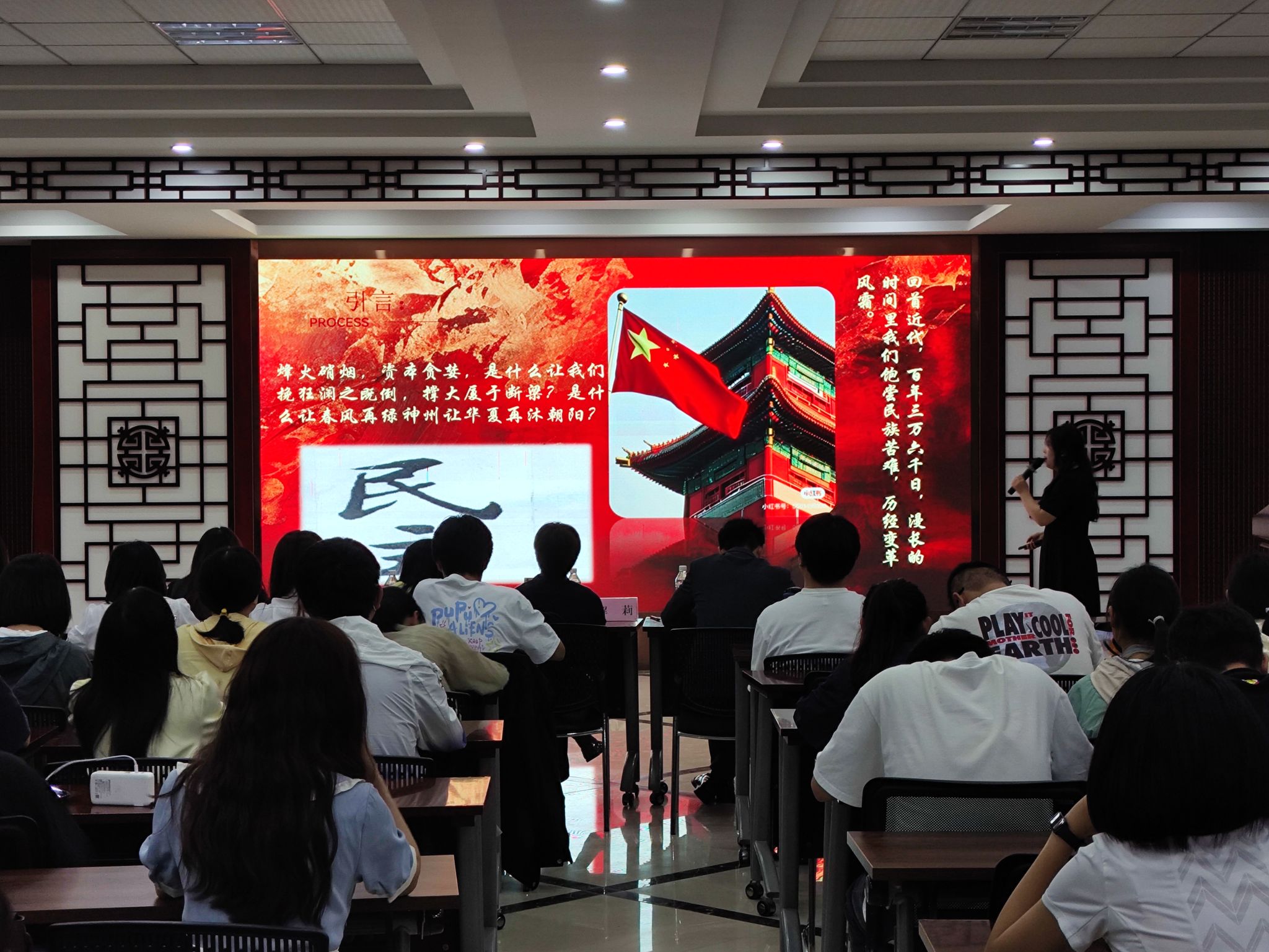 参赛者是2023级本科生,经班赛各推荐一支队伍进入院赛,邀请了马克思主义学院解莉、聂多伟、孙娜娜三位老师作为评委,部分老师和学生到场观看了比赛。本届“大学生讲思政”的主题是“民主”,七支队伍通过PPT讲解、现场演绎等方式,展示了他们对这一主题的理解与认识,评委老师根据评分规则进行了打分。