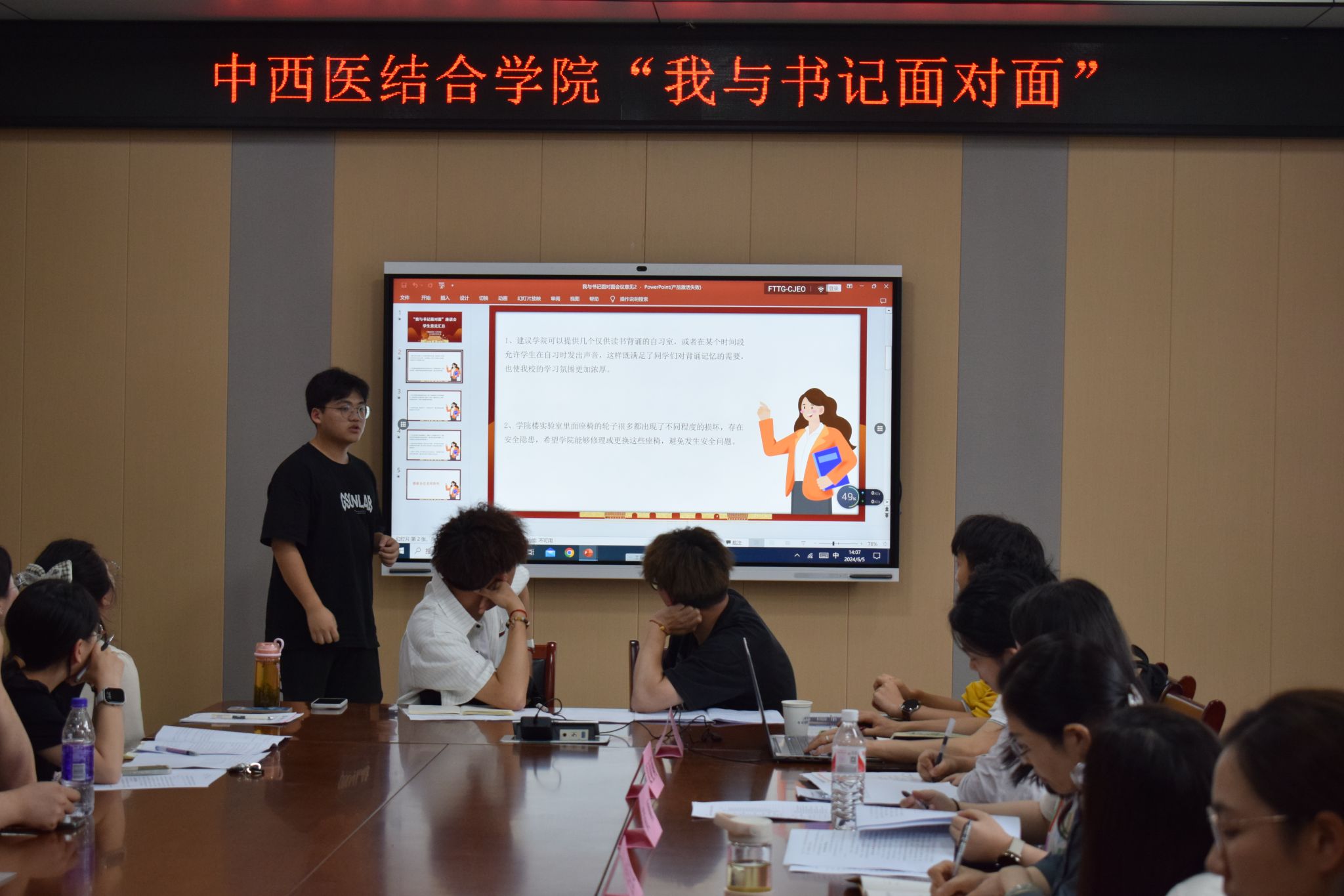 为进一步落实中西医结合学院“党建+信访”工作机制,深入了解学生的思想、学习和生活,提高学生参与学校“双一流”创建的责任感和使命感,6月5日,学院在B216会议室召开“我与书记面对面”交流座谈会。学院党委书记王红松,党委副书记顾义俊,团委、党务办公室、学生工作办公室有关负责老师,各班辅导员及各年级学生代表参会。会议由顾义俊主持。