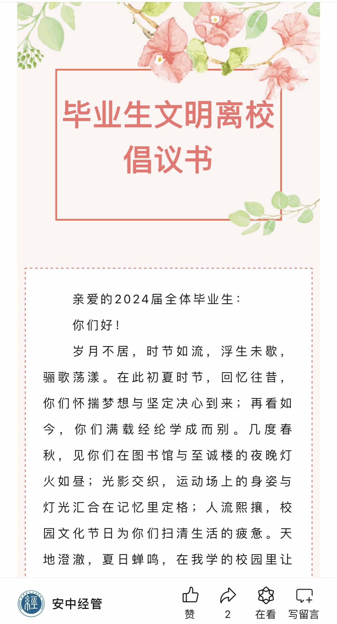 营造文明离校氛围,制作宣传标语,张贴宣传海报;向每一个毕业生宿舍发放《医药经济管理学院2024届毕业生文明离校倡议书》,倡议文明离校。