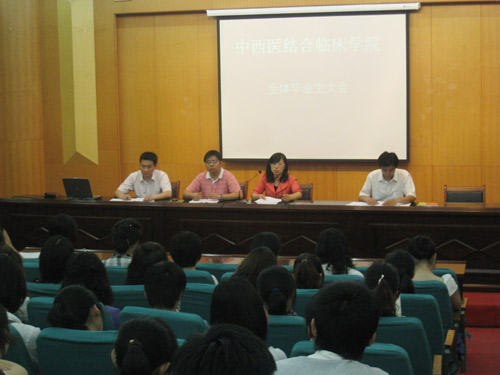 5月31日晚,中西医结合临床学院召开毕业生就业促进会暨安全文明离校工作会,该院党总支副书记顾义俊、就业实习秘书、毕业班辅导员及2010届250名毕业生参加了会议。