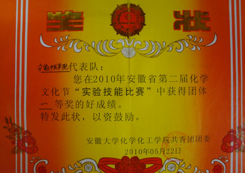 本届文化节通过化学科研成果展、学术论坛、学术讲座和实验技能大赛等多种形式的活动,宣传化学及化工相关知识,让同学们更加了解化学,关心化学。主办方对我代表队在本届化学文化节上出色表现,给予高度肯定。在实验技能比赛中,经过激烈的角逐,我校代表队获一等奖,中国科学技术大学、黄山学院获二等奖,合肥学院、安徽理工大学、安徽大学获三等奖。(方小军/文图 孙黎/编发 吴成海/编审)