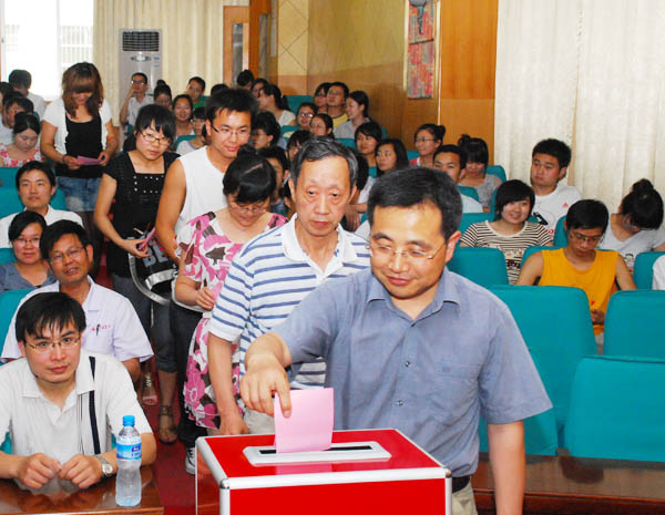 韩加生代表校党委组织部向大会宣读了《关于中西医结合临床学院党总支委员会换届选举候选人预备人选的通知》。大会表决通过了《党总支换届选举办法(草案)》、监票人、计票人建议名单。在监票人、计票人主持下,进行了投票选举,选举产生了(按姓氏笔画)方正清、申国明、朱继民、吴成长、顾义俊、彭青和、蔡标七位同志组成的新一届党总支委员。