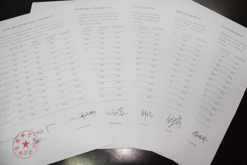该院就业工作领导小组组长方成武、副组长戴敏与各毕业班辅导员签订了《药学院2011届毕业生就业工作目标责任书》,根据完成情况经行奖惩,保证扎实、有序、高效、高质量地完成就业工作目标,再创就业工作新局面。(孙黎/文图 吴成海/编审)