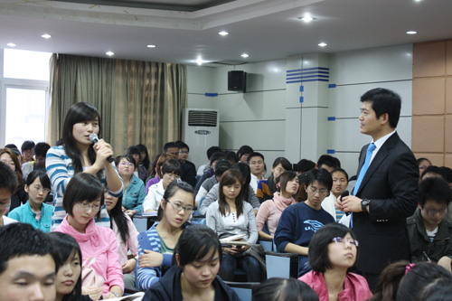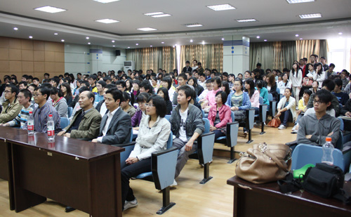 讲座中他将自己10余年外企工作经验与师弟师妹分享,讲座持续近4个小时,报告厅不仅座无虚席,更有许多同学站着听整场讲座,这场精彩、实用的讲座引发同学们阵阵掌声。
