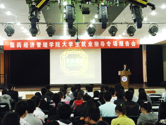 为促进大学生就业创业,帮助大学生树立积极就业的理念,增进校企之间的交流和合作,10月24日,由医药经济管理学院举办的“企业老总进校园系列活动”特邀请上海绿谷集团常务副总裁郭佩军先生来校做题为“创业、激情、梦想”的报告会。会前,学校党委副书记雷广宁,副院长彭代银亲切接待了郭佩军一行。 大会由经管学院院长李珑主持,招生与就业处副处长孟庆全、中西医结合临床学院党总支书记吴成长,医药经济管理学院党总支书记王伟、副院长王其巨、副书记周莉出席了会议,包括经管学院、药学院、中西医结合临床学院、信息工程学院、针灸骨伤临床学院等院部在内的近500名学生参加了报告会。