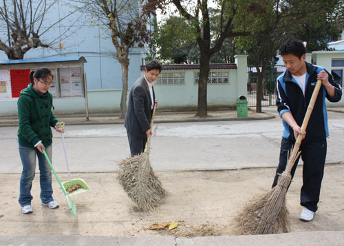 药学院党总支副书记张亚辉、北区综合办公室及北区各大一班辅导员齐聚北区,拿起扫帚、簸箕、拖把等卫生工具和学生们一起参加了大扫除活动。领导和学生们一起,对北区的楼道、橱窗、教室、寝室等清洁区进行了认真的打扫与擦拭。
