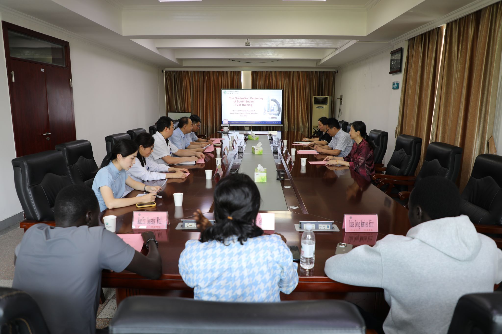 6月17日上午,第一临床医学院举行2025年度南苏丹进修人员结业典礼,庆祝三位南苏丹医务人员顺利完成中医进修学习。安徽省卫生援外办公室主任张松卫,学校外事办副主任昂文平,医院院长杨文明,医院相关职能部门负责同志,针灸科、妇产科带教老师以及三名南苏丹医务人员参加了典礼。结业典礼由杨文明主持。