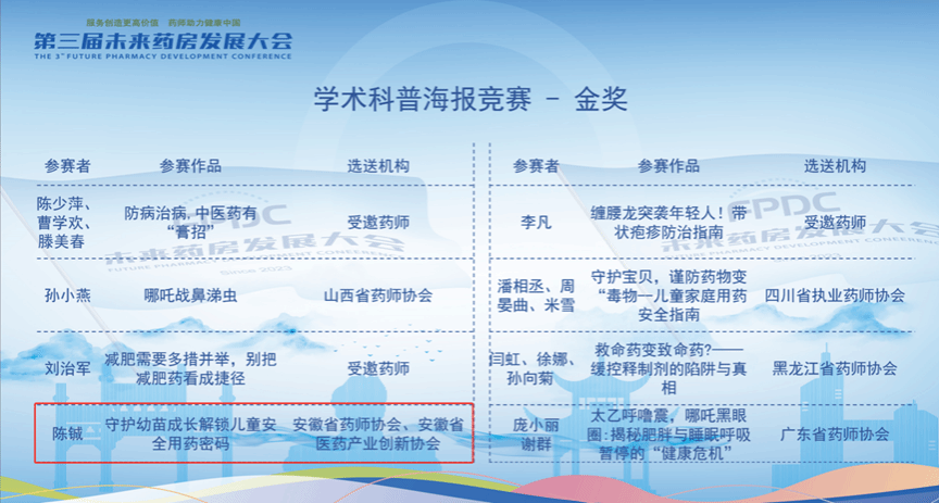 近日,由中国非处方药物协会、湖南省药师协会联合主办,25个省市药师协会及学会倾力协办的“第三届未来药房发展大会”在湖南长沙举行。大会设置了“药师职场技能比赛”,从不同维度考验药师的专业素养、沟通能力、创新思维和科普能力,我校第二附属医院药学部主管药师陈铖凭借扎实的专业根基、出色的临场发挥以及创新性的内容呈现形式,荣获学术海报竞赛金奖、科普演讲银奖及网络人气奖等多项殊荣,充分展现了医院药师队伍卓越的综合素养与创新活力。