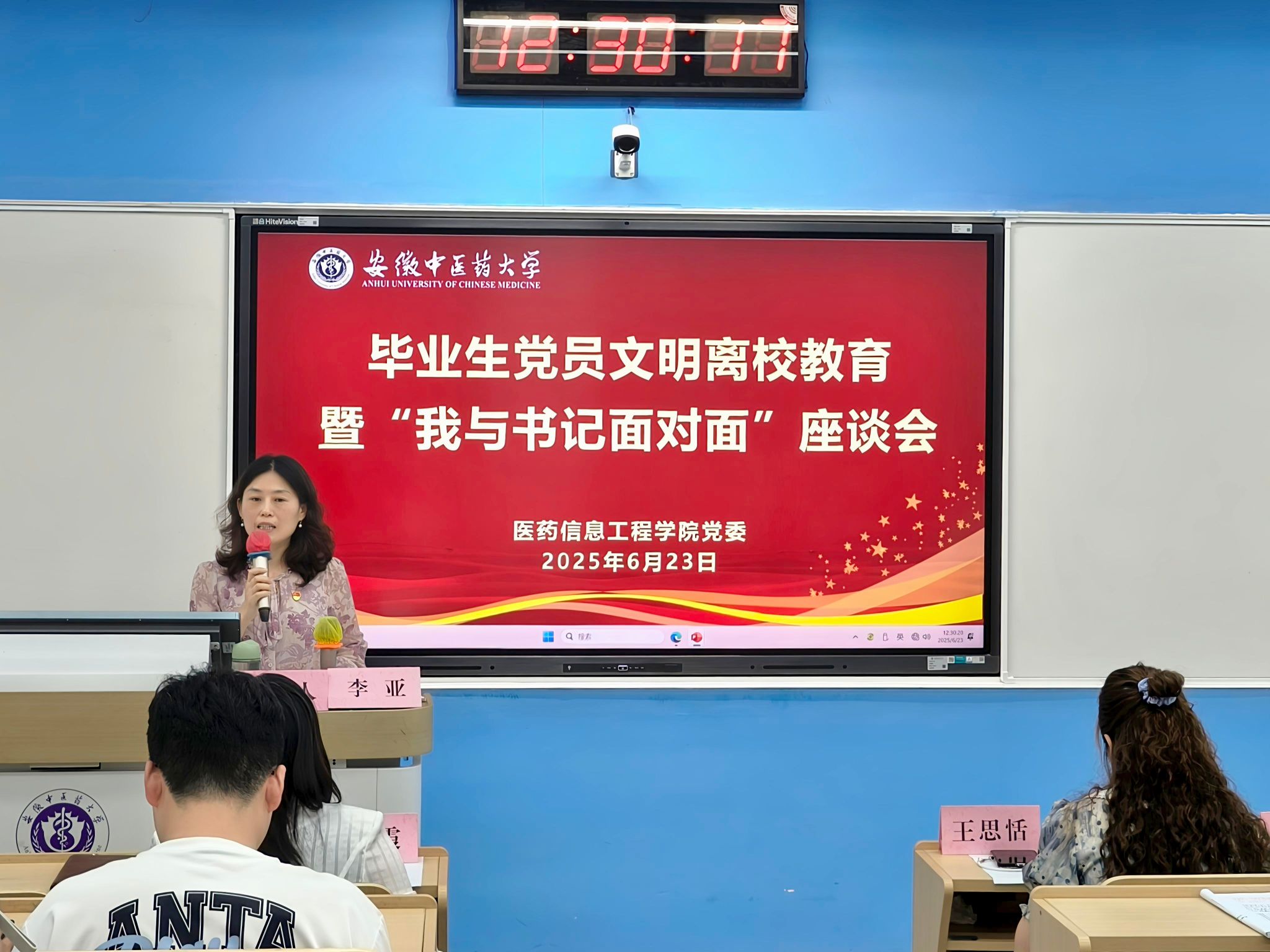 6月23日,医药信息工程学院开展2025届毕业生党员文明离校教育暨“我与书记面对面”座谈会。学院党委书记高霞,党委副书记、纪委书记李亚,党政办主任、各学生党支部书记及2025届毕业生党员参加座谈会。会议由李亚主持。