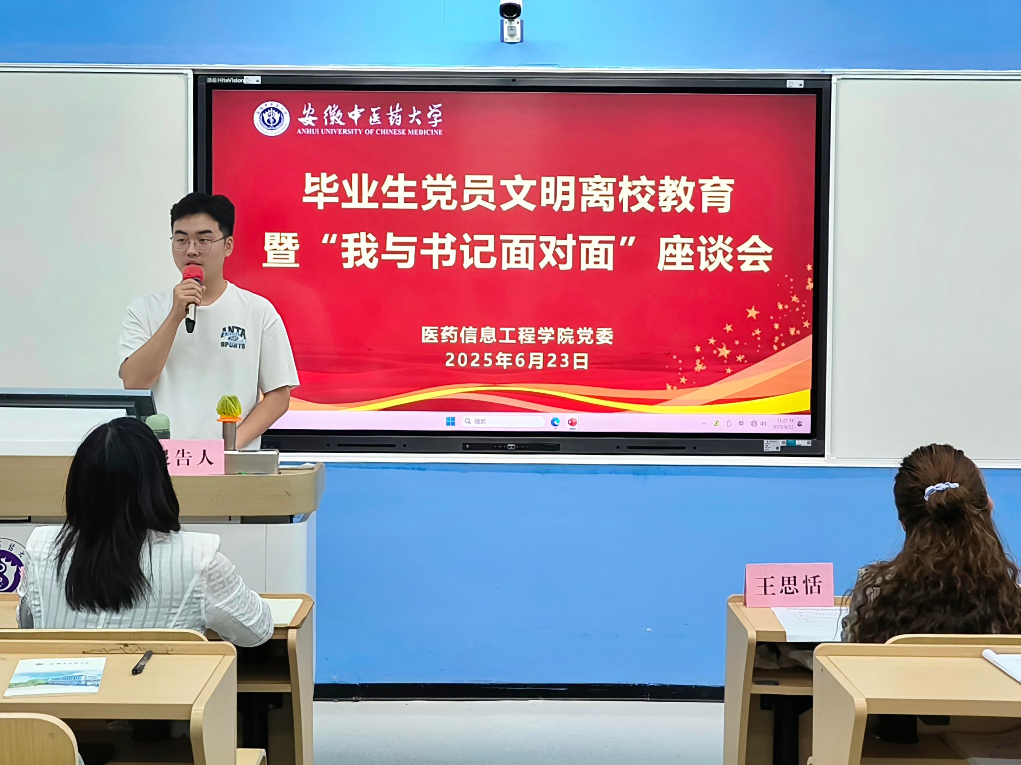 2021级生物医学工程班王家鸣同学作为毕业生党员作交流发言,他表示,“将以医药信息人的专业素养、责任意识和创新精神,为祖国的医药IT建设、为健康中国的伟大事业贡献我们的智慧和力量。”