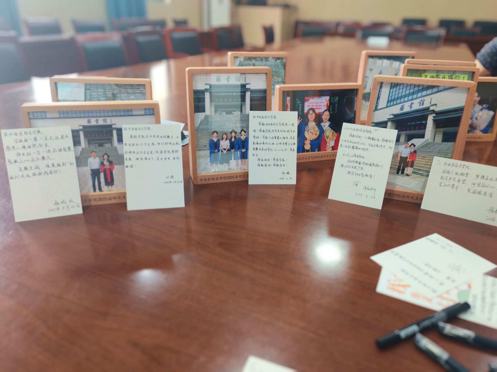 活动前期,学院通过线上线下渠道广泛征集毕业生与导师的合影素材及师生寄语,同步完成照片冲印、定制相框等筹备工作。6月26日,“明信片传情・岐黄寄梦” 活动在学院B216会议室举行,现场首先展示导师为毕业生手写的祝福明信片,字里行间满是对学子 “中西合璧、守正创新” 的专业嘱托与人生期许。随后,毕业生代表们手持明信片,将对学院的感恩之情与职业展望凝于笔端,投递至 “毕业信箱”。