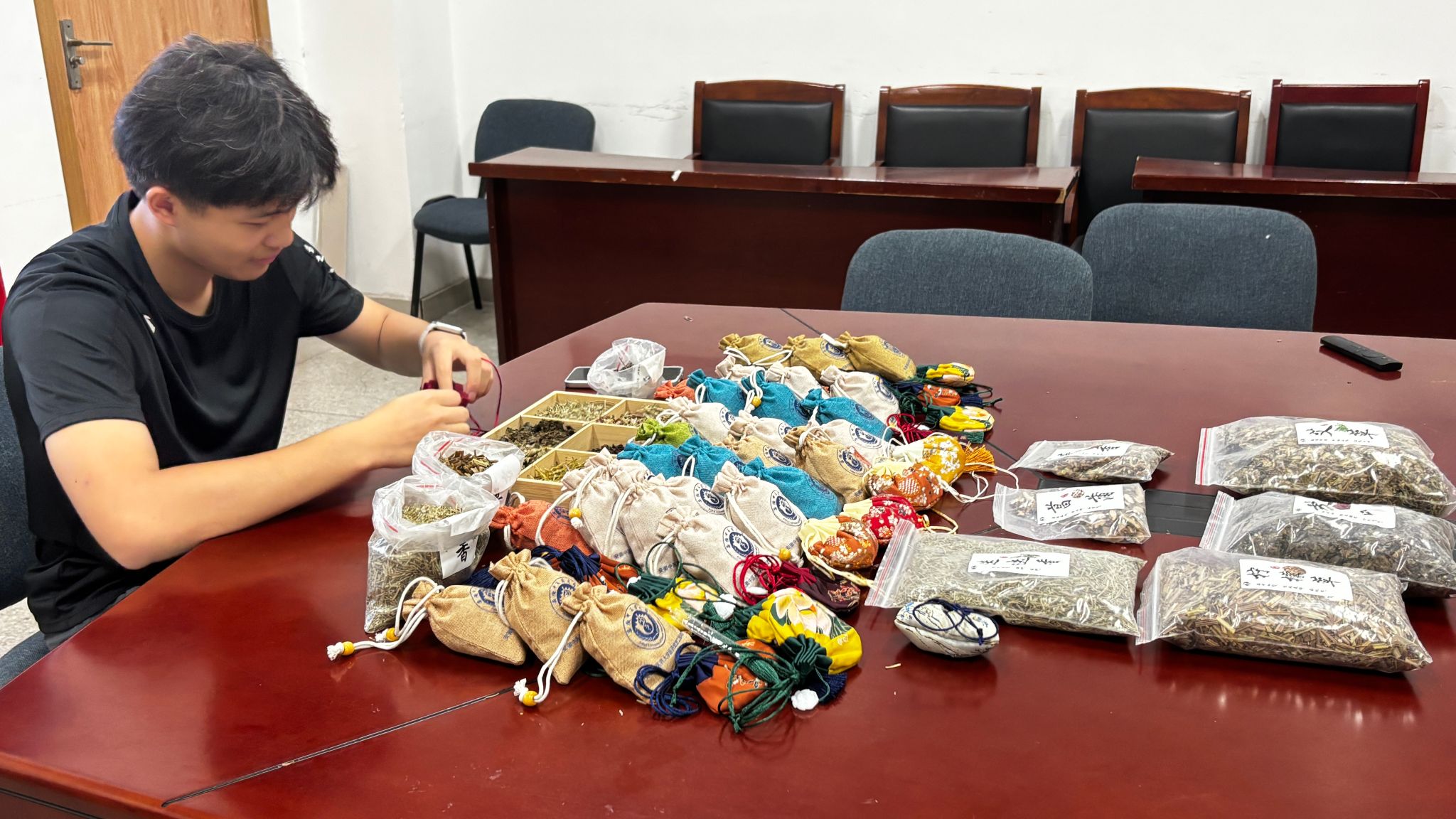 艾叶可宁心安神、驱蚊避秽,薄荷能舒缓压力、通窍清目。当这些天然药材被细心缝入一针一线亲手制作的香囊中,淡淡的草药清香,不仅为教师们驱散疲惫,更在他们伏案深耕的夜晚,点亮一缕宁静与温暖。这枚香囊,盈满的不仅是草木芬芳,更是学子对老师顺遂安康、平安喜乐的深切祝福。