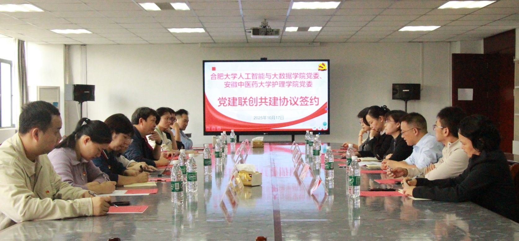 10月17日下午,护理学院党委与合肥大学人工智能与大数据学院党委,在合肥大学举行党建联创共建签约活动,两院党委班子成员、各党支部书记等二十余名代表齐聚现场,共商合作事宜。