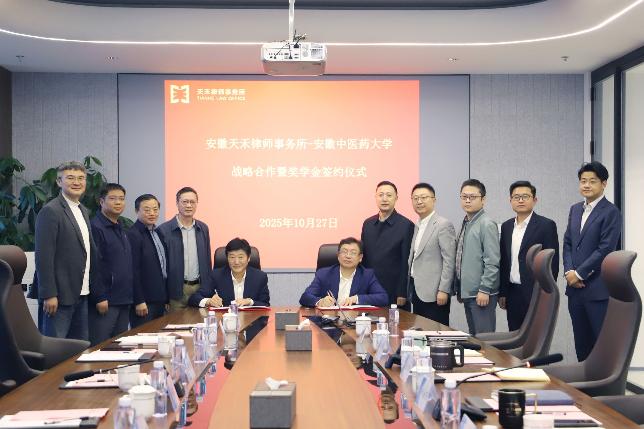 10月27日下午,安徽中医药大学教育发展基金会与安徽天禾律师事务所战略合作暨奖学金签约仪式在安徽天禾律师事务所举行。教育发展基金会理事长彭代银、副理事长张永群、吴达武,天禾律所创始合伙人、党委书记朱金宏、管委会主任张大林,权益合伙人、我校2005届医药贸易专业校友陈军以及学校社会合作处处长方晓、医药经济管理学院书记张军等出席仪式,仪式由天禾律所创始合伙人、党委书记朱金宏主持。