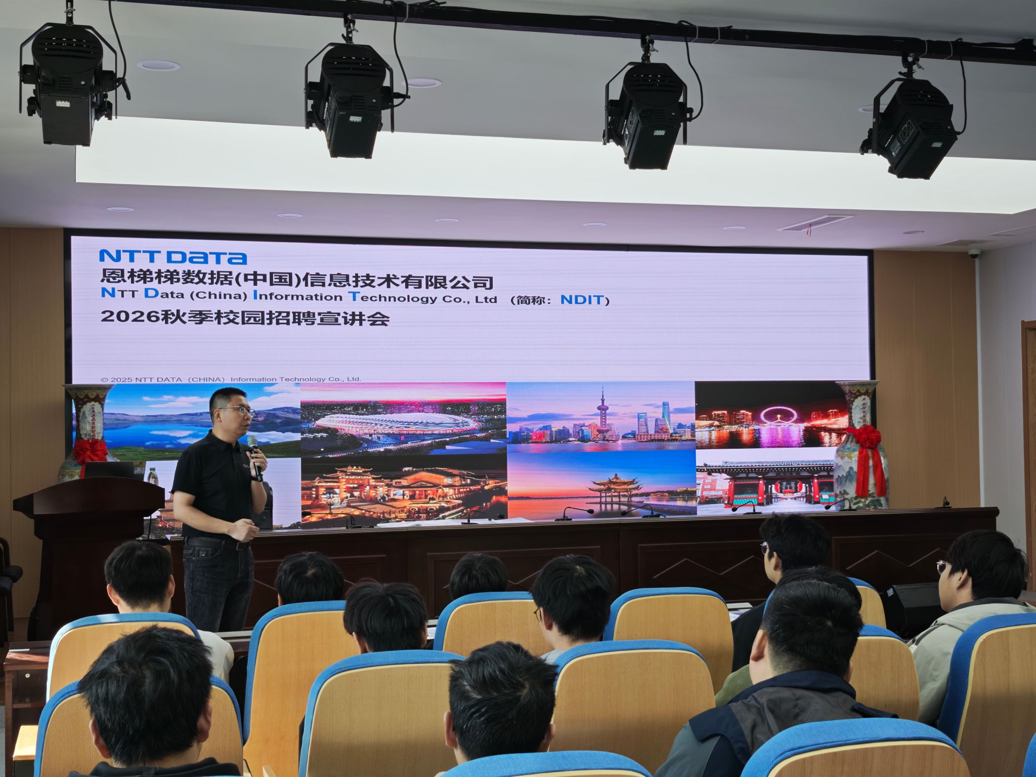 招聘会伊始,岳剑峰向在场同学全面介绍了恩梯梯的发展历程、核心业务领域、行业地位及未来战略规划。岳剑峰详细介绍了此次校招岗位的具体职责、专业要求及能力素养需求,针对同学们尤为关注的福利待遇,他从薪资体系、假期、职业培训计划、晋升发展通道等方面进行了全面说明,让同学们对未来的职业发展与保障有了清晰认知。