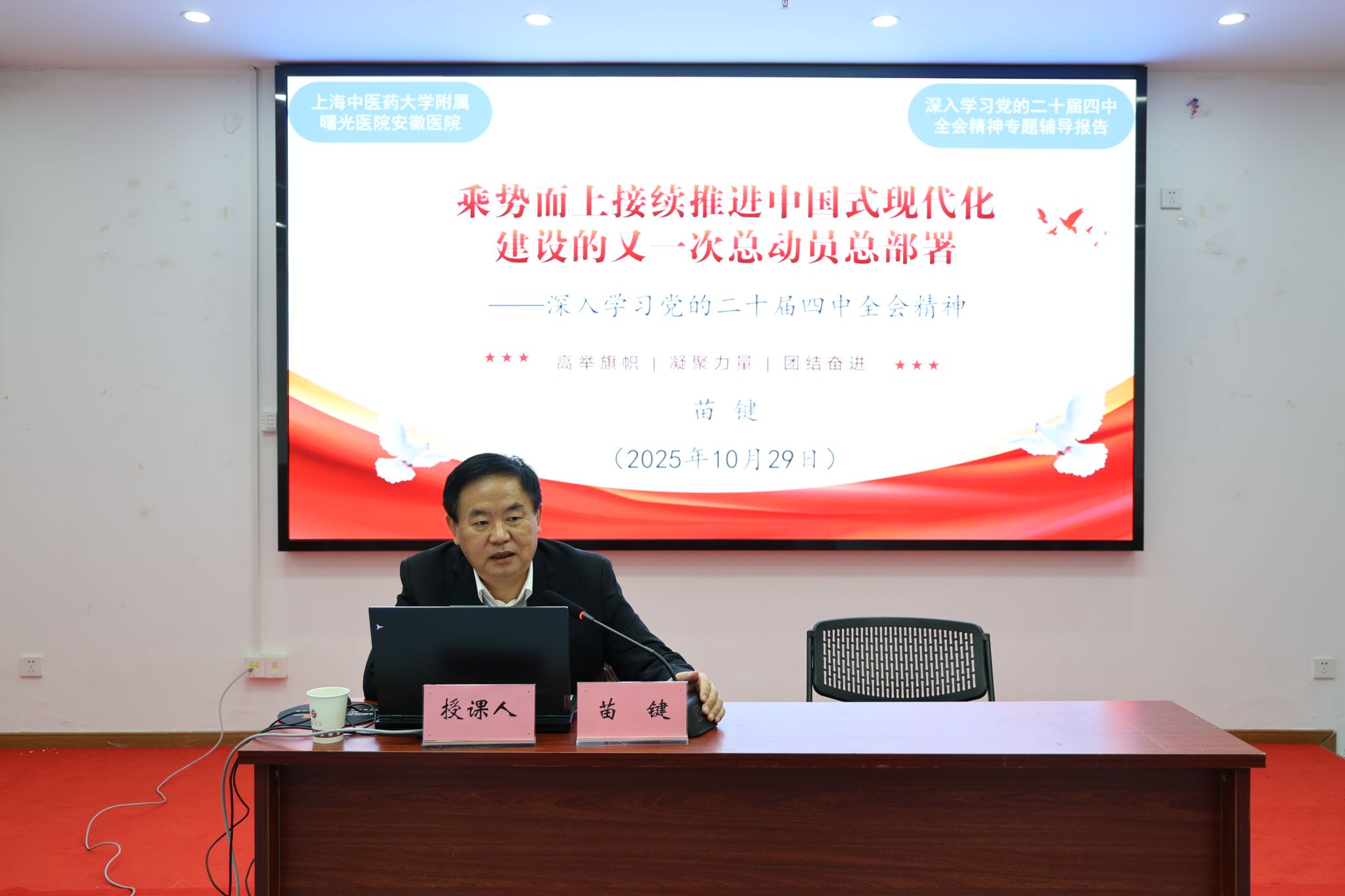 会议邀请中共安徽省委党史研究院(安徽省地方志研究院)原副院长苗键作题为《乘势而上接续推进中国式现代化建设的又一次总动员总部署——深入学习党的二十届四中全会精神》的专题辅导报告。报告详细介绍了全会概况,深刻总结了党和国家“十四五”时期取得的重大成就,全面分析了“十五五”时期我国面临的发展形势,重点阐释了未来五年国家经济社会发展的顶层设计与战略规划。他在报告中指出,加快建设健康中国,需实施健康优先发展战略,统筹发展与安全,为群众提供公平可及、系统连续、优质高效的健康服务。