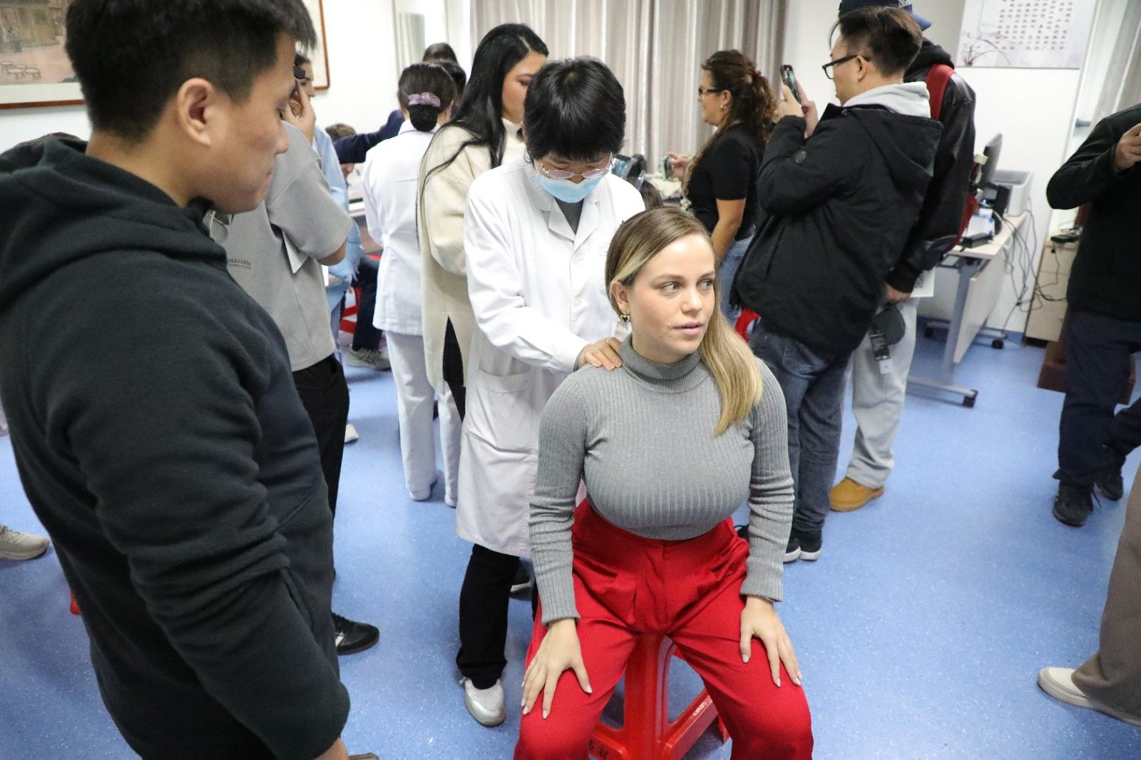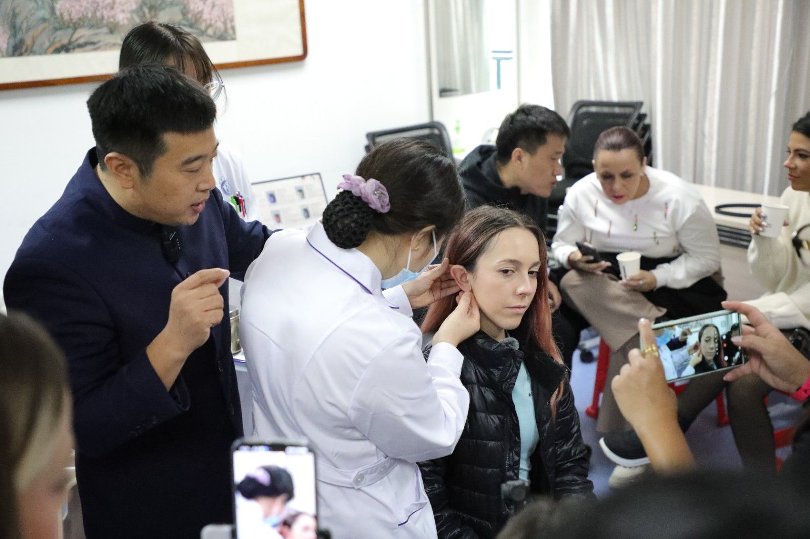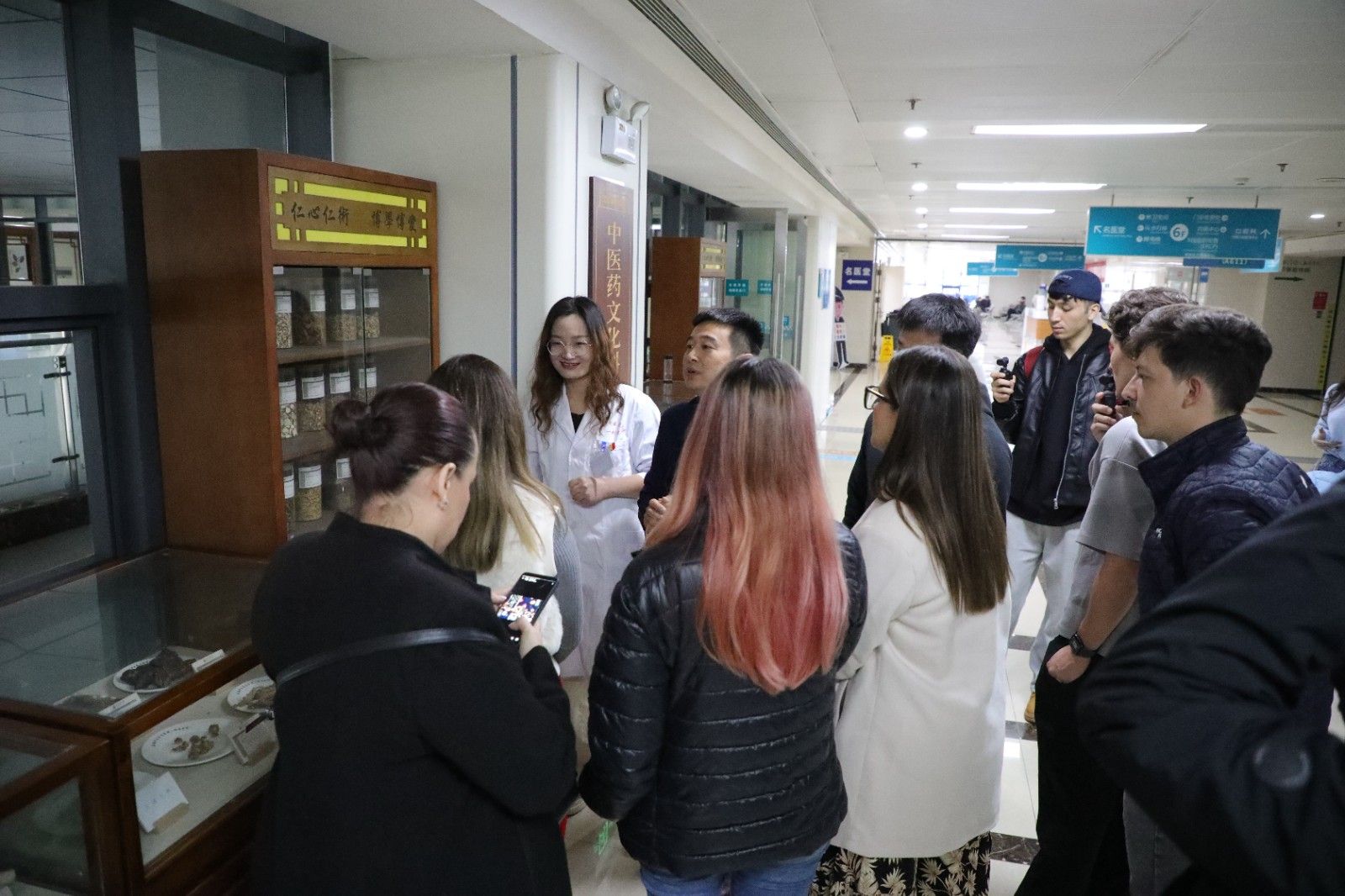 学校人文与国际教育交流学院潘银星老师向代表团介绍了华佗济世救人的历史典故以及中医药学的起源与发展。他们对华佗“医者仁心”的精神内核以及“麻沸散”“五禽戏”等医学成就深表赞叹。代表团先后参观医院华佗像、门诊一楼中药房、科研楼16楼的国医大师工作室、门诊六楼的中医药文化科普基地等地区,医院工作人员生动讲述了中医药在不同历史时期的发展故事以及中医药文化在现代社会的传承与创新实践,让代表团成员对中医药文化有了更全面、系统的认知。在门诊三楼中医大讲堂,代表团亲身体验了针灸推拿、耳穴埋豆等中医药特色项目。