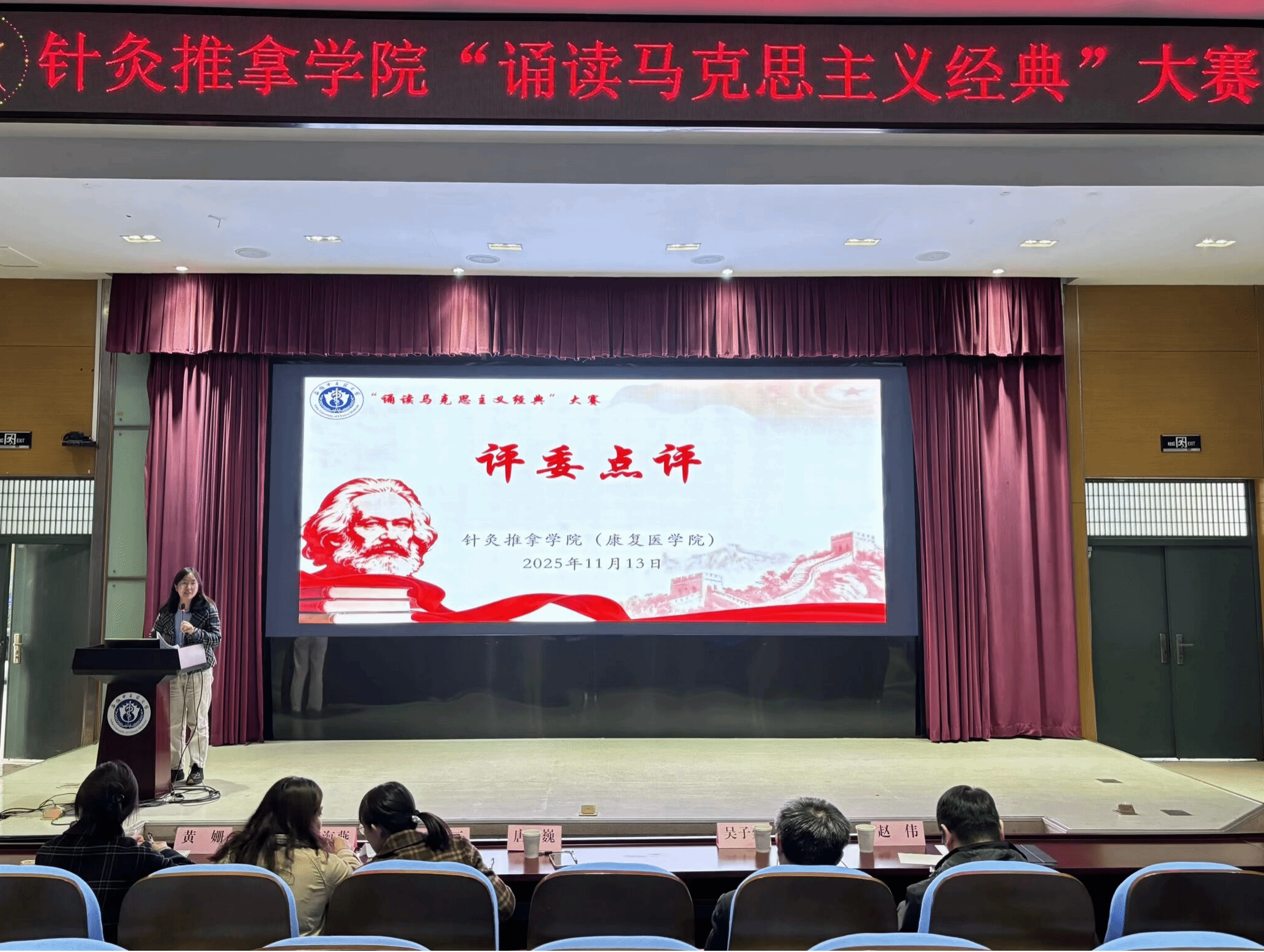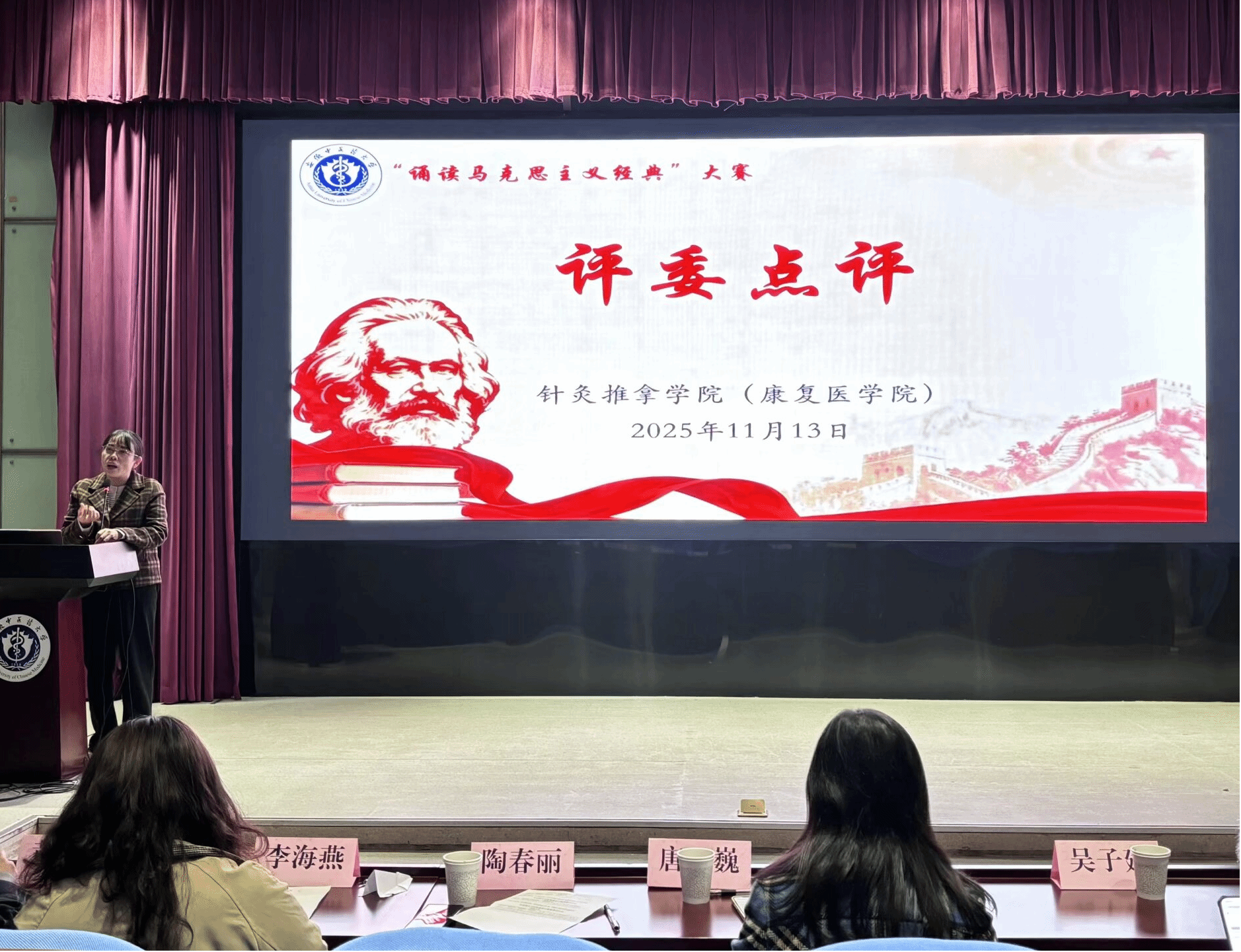 积极引导学生品读马克思主义经典著作,汲取真理的磅礴力量,11月13日,针灸推拿学院举办第九届“诵读马克思主义经典”大赛。针灸推拿学院党委书记唐巍、马克思主义学院教师陶春丽、学院党委副书记李海燕、副院长吴子建、辅导员代表、学生代表担任评委。