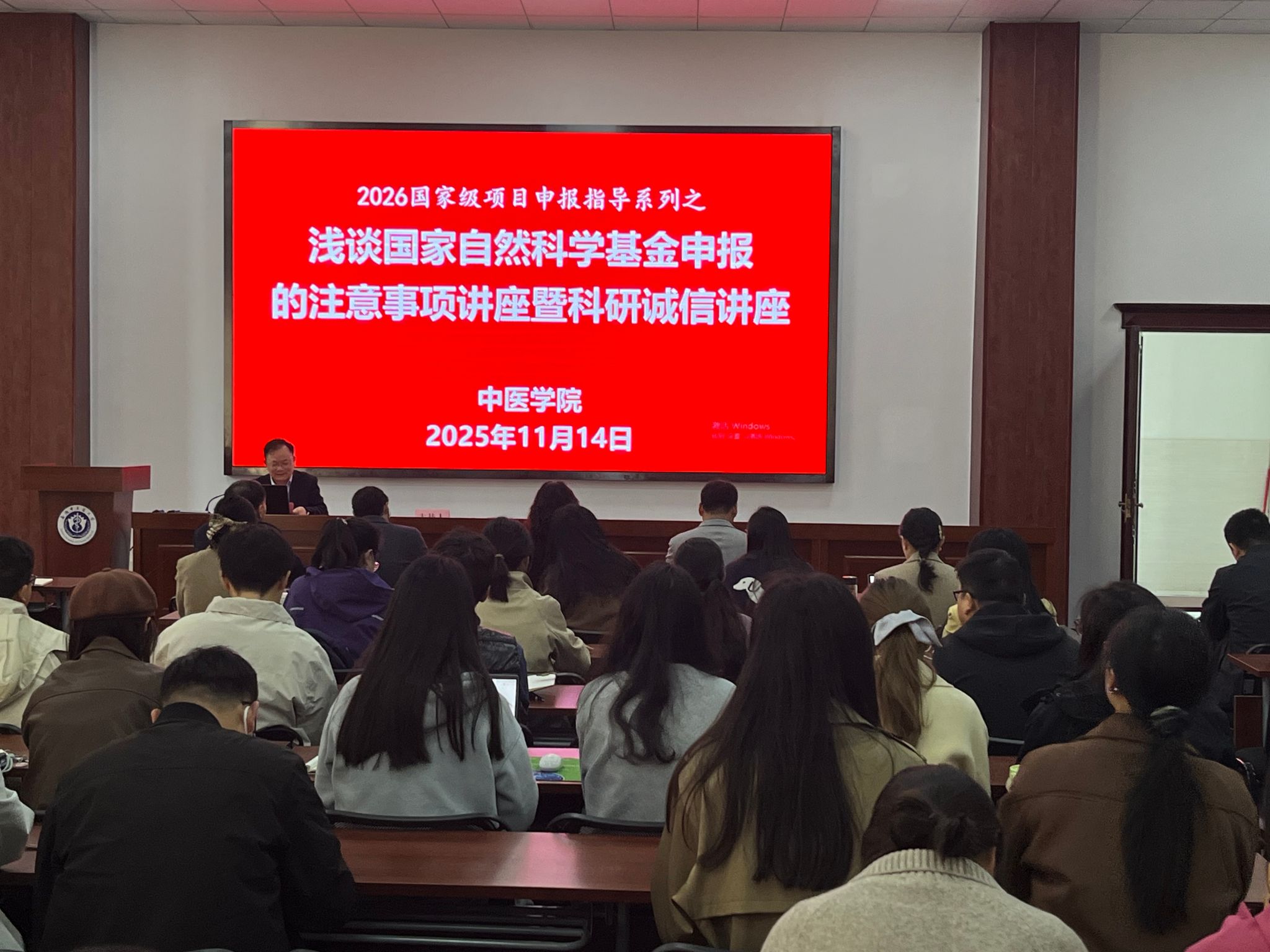 为系统提升学院教师2026年度国家自然科学基金项目申报能力与质量,进一步强化学术诚信与科研道德规范建设,11月14日上午,由中医学院与学校科技处联合主办、细胞分子生物学(脑病)实验室协办的专题学术报告会在中医学院举行。会议特邀中药功效成分发掘与利用全国重点实验室PI、贵州医科大学—贵州省卫生发展研究院副院长、博士生及博士后合作导师巩仔鹏教授担任主讲。报告会由中医学院院长方向明主持,各学院教师及研究生踊跃参与。