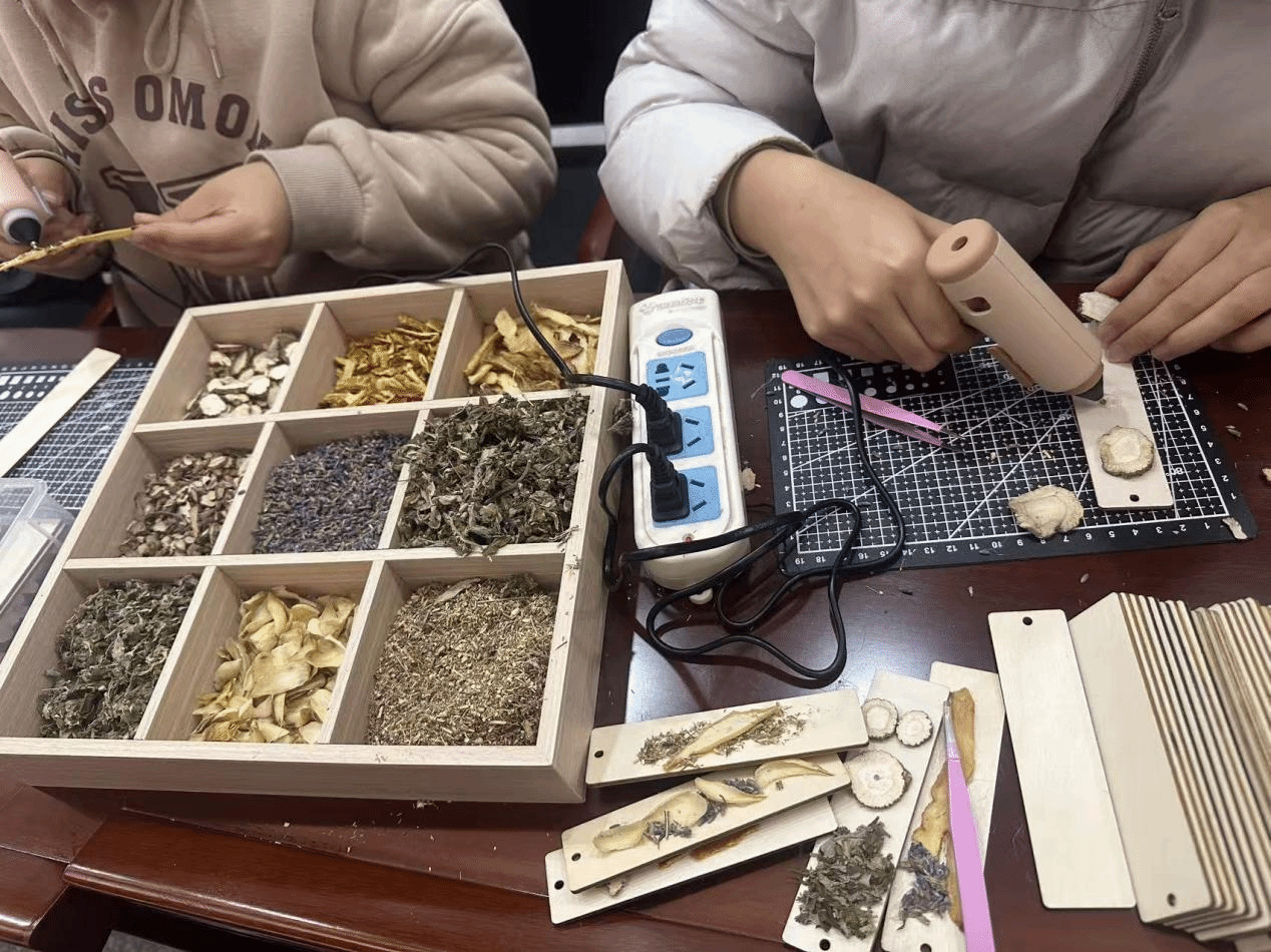 活动将劳动教育与中医药文化创新实践深度融合。本草书签以薰衣草、菊花等道地药材为原料,经热熔胶定格自然之美;艾草锤选用三年陈艾搭配其他药材,手工制作出兼具实用性与观赏性的养生工具;足浴包将当归、生姜等药材科学配比,制作出驱寒祛湿、舒缓疲劳等不同类型足浴包;中药香薰用天然中药香材与蜂蜡制作可悬挂的香薰蜡片,散发淡雅药香,装饰空间同时发挥养生作用。每一件作品均标注药材功效与使用说明,既承载劳动汗水,亦传递中医药智慧。
