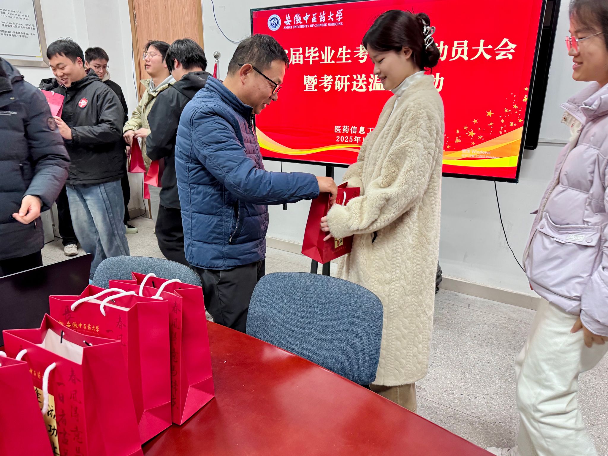 随后,学院为考研学生代表送上精心准备的 “考研暖心礼包”。礼包虽轻,却承载着学院对同学们的深切关怀与殷切期望,传递着学院对备考学子的鼓励与祝福,切实将温暖与力量送到学子心坎上。