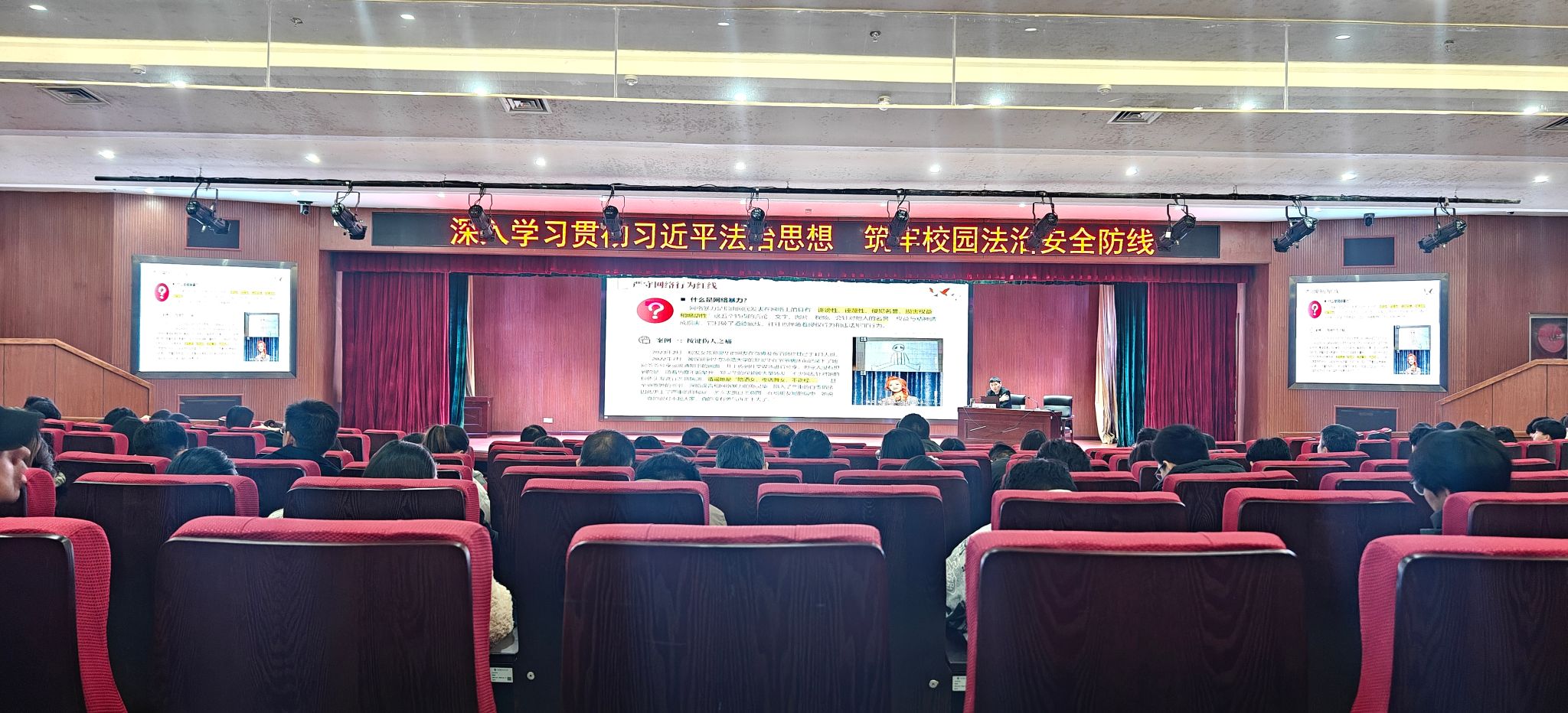 于海波从普法视频导入,说明我们每个人从胎儿开始就享受法律的保护,贯穿整个生命过程。于海波为师生列出了应知应会的“核心法律清单”,让大家了解到遇到相关纠纷时如何拿起法律武器保护自己。通过违纪警示录的展开,于海波逐一分析了高校大学生常见的违纪、违法现象,以及对应的法律条文和处罚结果,对大学生日常行为作出警示。他还对法律如何界定科研经费使用的违法行为进行了具体的解读。结合医药信息工程学院的学科特点,于海波剖析近年来典型的网络侵权、数据安全等案例,深入浅出地阐述了相关的法律法规。他特别提醒老师们和同学们在网络空间中要明晰法律边界,保护个人信息,规范技术应用,牢固树立法治思维与网络安全意识。