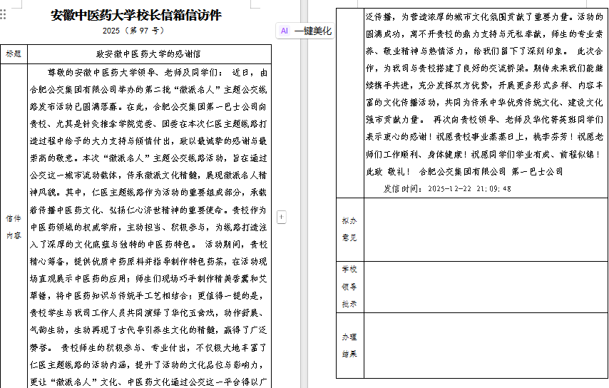 12月24日,针灸推拿学院收到合肥公交集团第一巴士公司发来的感谢信,对学院在12月18日“仁医专线”启动仪式中的专业支持与文化赋能表示诚挚谢意。这封跨越城市交通动脉的感谢信,不仅见证了校企协同创新的实践成果,更彰显了中医药文化融入城市公共服务的创新路径。